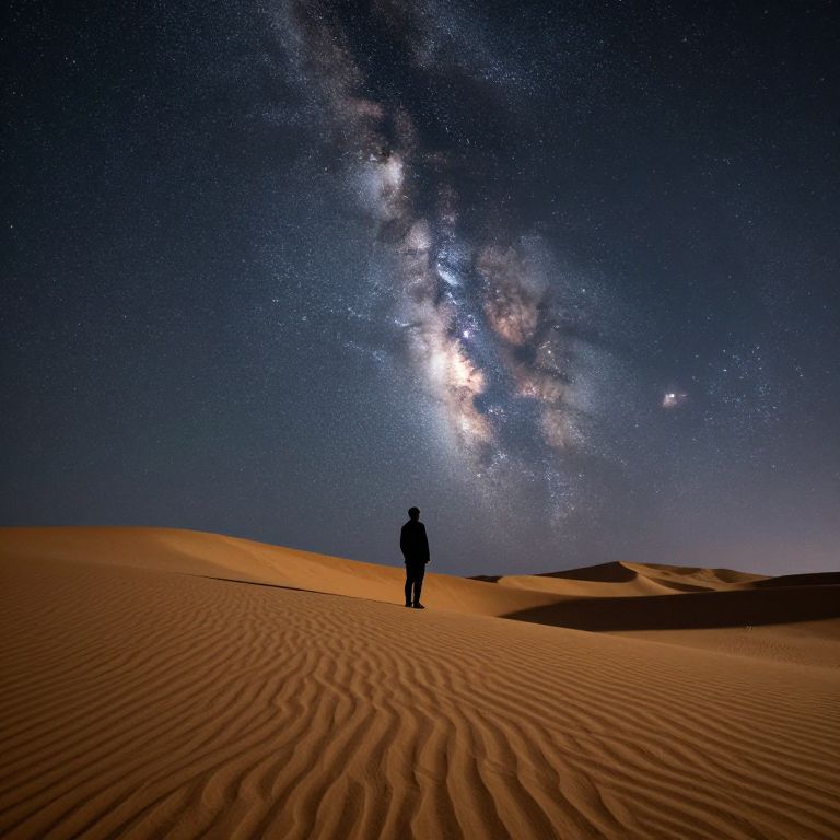 Silhouetted against the vast expanse of a starry night sky, a lone figure stands amidst rippling golden sand dunes, gazing upward at the Milky Way's radiant arc stretching across the heavens.