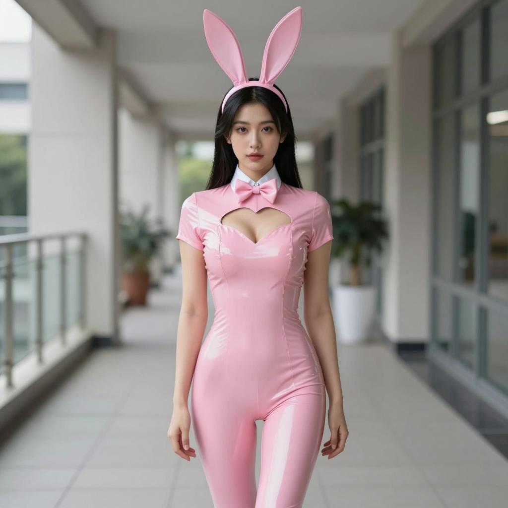 Rena rouge costume, photorealistic, young woman, red leather cat ears, red wavy hair, red leather bodysuit with black straps, high-cut legs, gold buckle, medium-sized breasts, fair skin, serious expression, urban background, blurred buildings, daytime, standing on balcony, cosplay, detailed ures, realistic lighting, realistic shading, digital artwork, SD/T2I style, high quality, balanced composition
