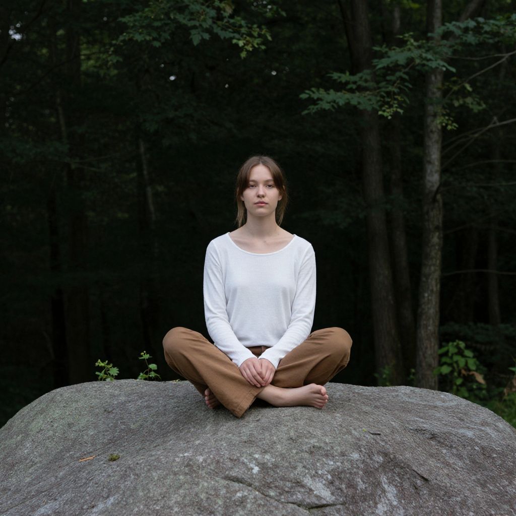 Photograph of a young Caucasian woman with fair skin and brown hair, sitting cross-legged on a large gray rock in a dark forest. She wears a white long-sleeve shirt and brown pants, barefoot with her hands resting on her lap. Her expression is calm and focused. The background is dense with tall trees and dark green foliage, creating a stark contrast with her light clothing. The texture of the rock is rough, and the lighting is natural, highlighting her figure against the shadowy forest backdrop.