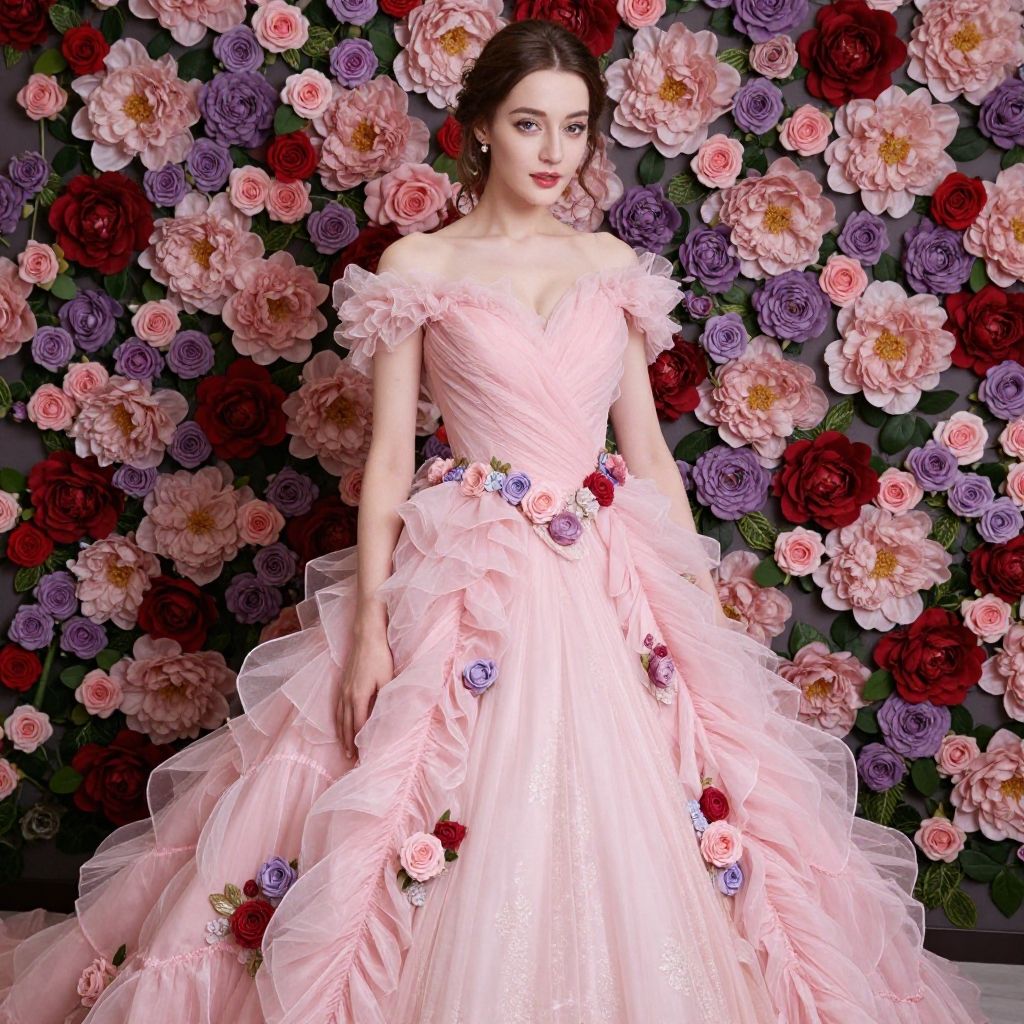 Photograph of a fair-skinned woman with dark brown hair, styled in an elegant updo, standing against a backdrop of densely packed, vividly colored roses in shades of pink, red, and purple. She wears an off-the-shoulder, pale pink ball gown adorned with layers of ruffled tulle and interspersed with small, colorful floral accents. The dress has a cinched waist and a full, flowing skirt. She has red lipstick and subtle eye makeup, exuding a poised, sophisticated demeanor. The overall composition is vibrant and romantic, with the floral background enhancing the ethereal quality of her attire.