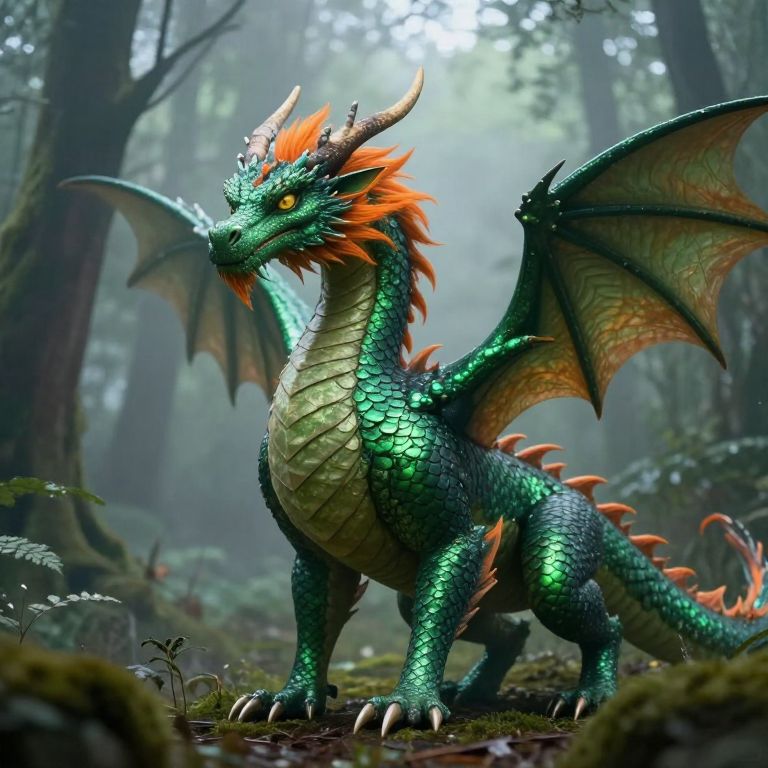 Imagine an enchanting scene reminiscent of Arthur Rackham's illustrations, where a regal dragon arises from a forest glade enveloped in mist, its ethereal presence illuminating the surrounding landscape. This majestic creature boasts scales that gleam with iridescence, resembling stained glass, as it extends its wings in preparation for flight. The perspective, from an unusual vantage point, showcases the intricate beauty of the dragon's form, highlighting delicate wing veins and sharp teeth within its formidable maw. Against a backdrop of ancient trees adorned with shimmering lights and lush foliage, this awe-inspiring beast dominates the sky, evoking a sense of wonder and magic as it soars above, leaving onlookers spellbound by this extraordinary sight.