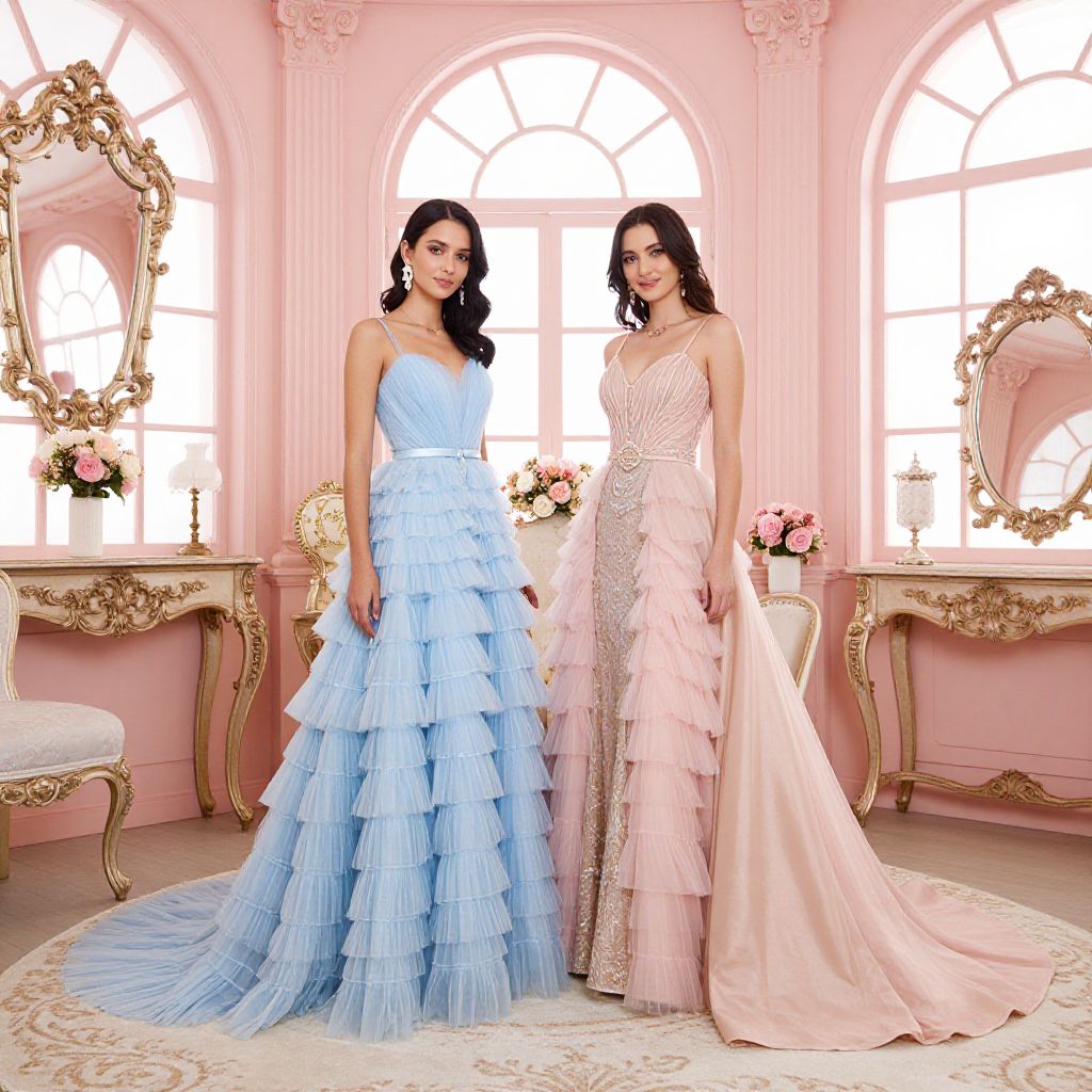 Two women wearing lavish, multi-layered evening gowns stand in a pastel pink room with large arched windows and ornate mirrors. One gown is light blue with ruffled tulle layers, while the other features a combination of soft pink and beige with intricate bodice details. The setting includes decorative furniture and floral arrangements, creating a luxurious and feminine ambiance.