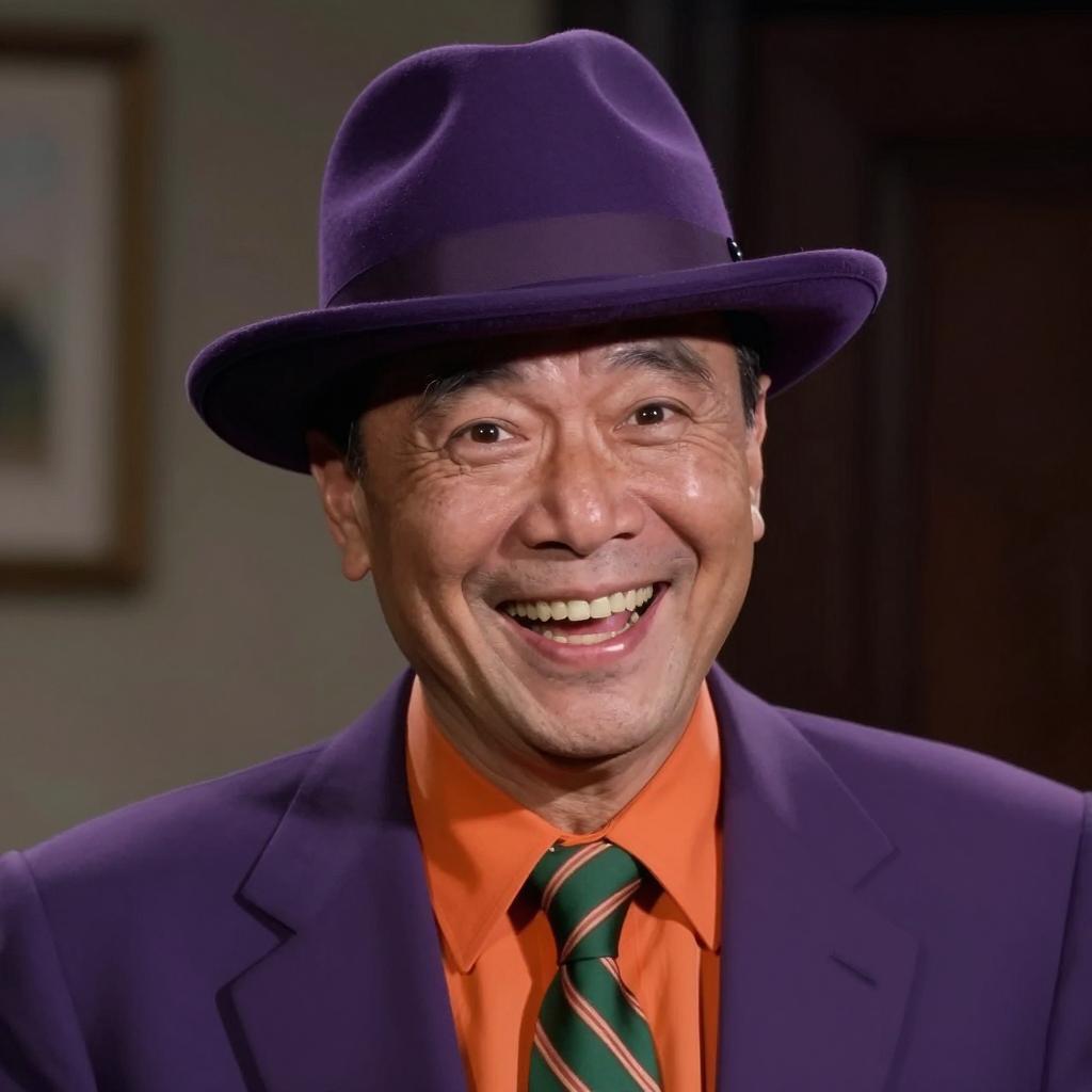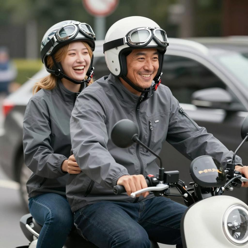 Five people in a black sports car at night. Front seats: middle-aged man in white shirt, black hat, laughing, older man in black hat, screaming. Back seats: woman in red top, middle-aged man with closed eyes, sleeping. Car headlights on, bright. Dark background, foggy. License plate: "DAV 360". Everyone crowded, intense expressions.