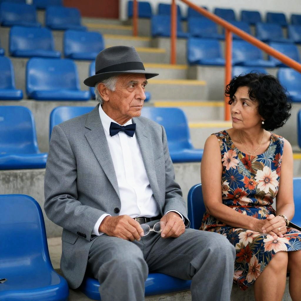 Photograph of an older man and woman sitting on blue stadium seats. Man in gray suit, bow tie, and gray fedora, holding glasses and a small object. Woman in floral dress, black short curly hair, looking at him. Background: empty stadium seats, stairs, and orange railings. Man's expression: neutral, woman's expression: attentive.