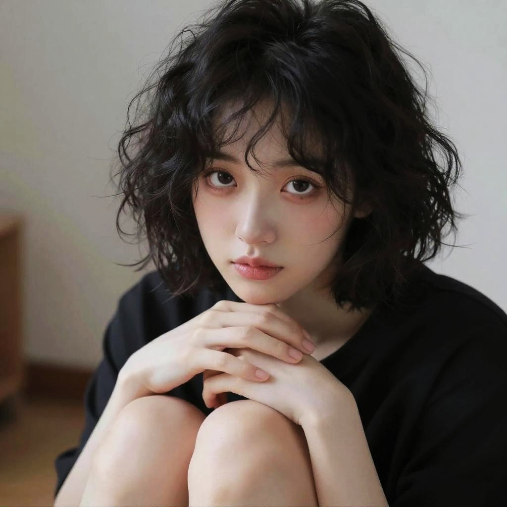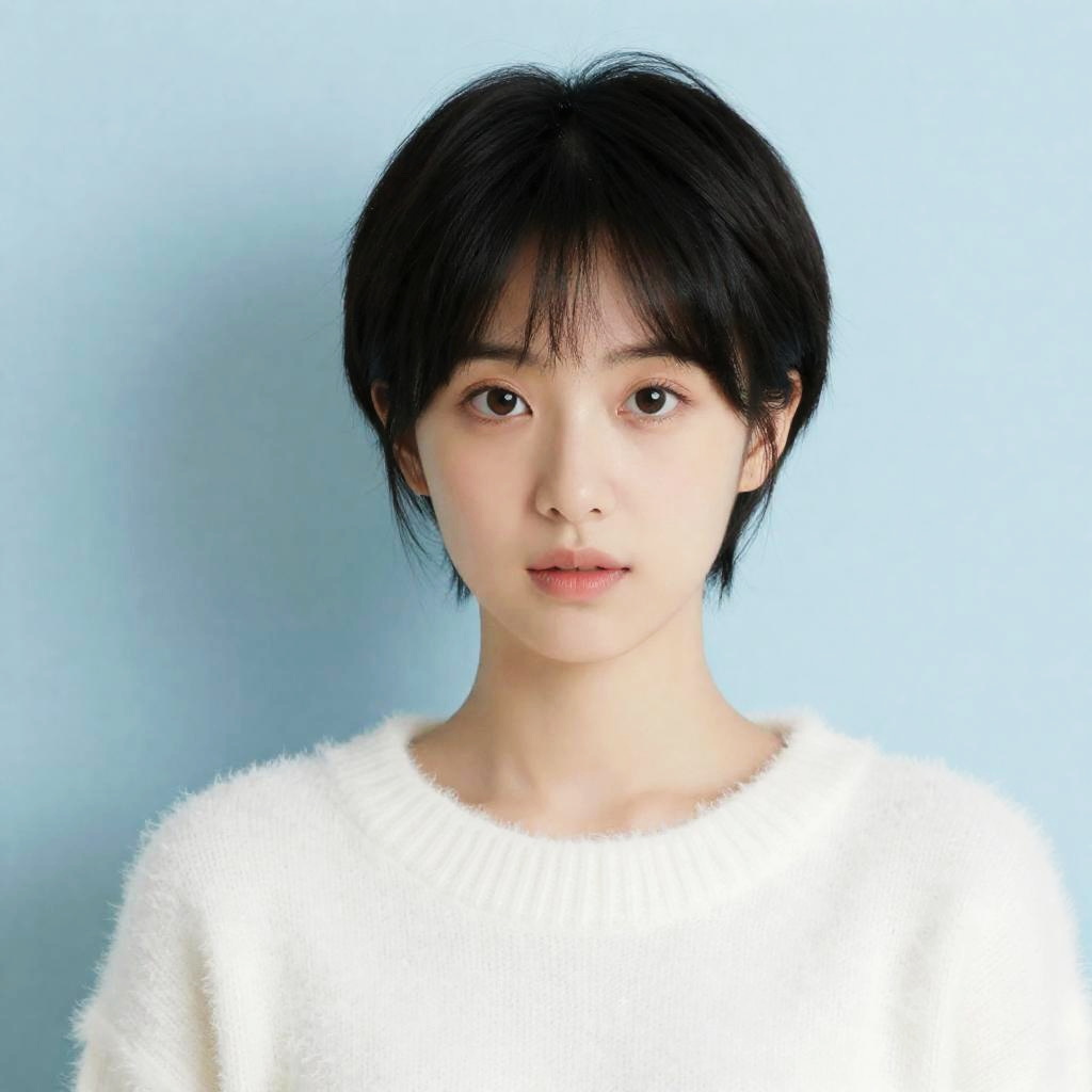 Realistic 1girl, female Chinese idol portrait, upper body, black pixie cut, brown eyes, indoors, pastel blue background, soft lightning, wearing a white fluffy sweater, winter theme, girlish charm