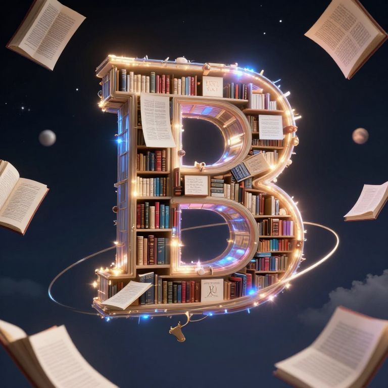 A digital CGI illustration of a glowing, illuminated letter "B" made of bookshelves filled with colorful books. The letter is adorned with bright, twinkling lights in blue, white, and yellow. Open books float around the letter against a deep blue, starry night sky with a few small, white planets. The books have white pages with black text, some partially obscured by the glowing "B". The style is whimsical and magical, evoking a sense of knowledge and wonder. The overall composition is dynamic, with the floating books adding motion and depth.