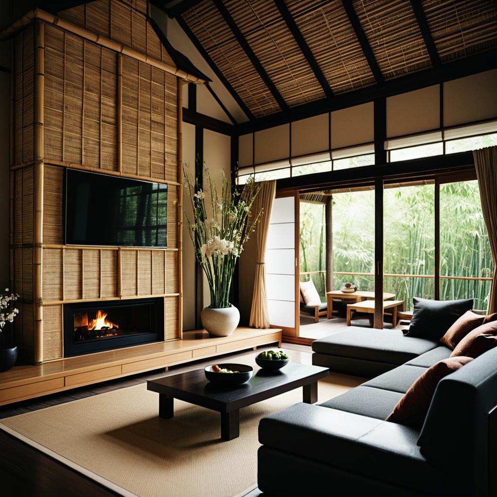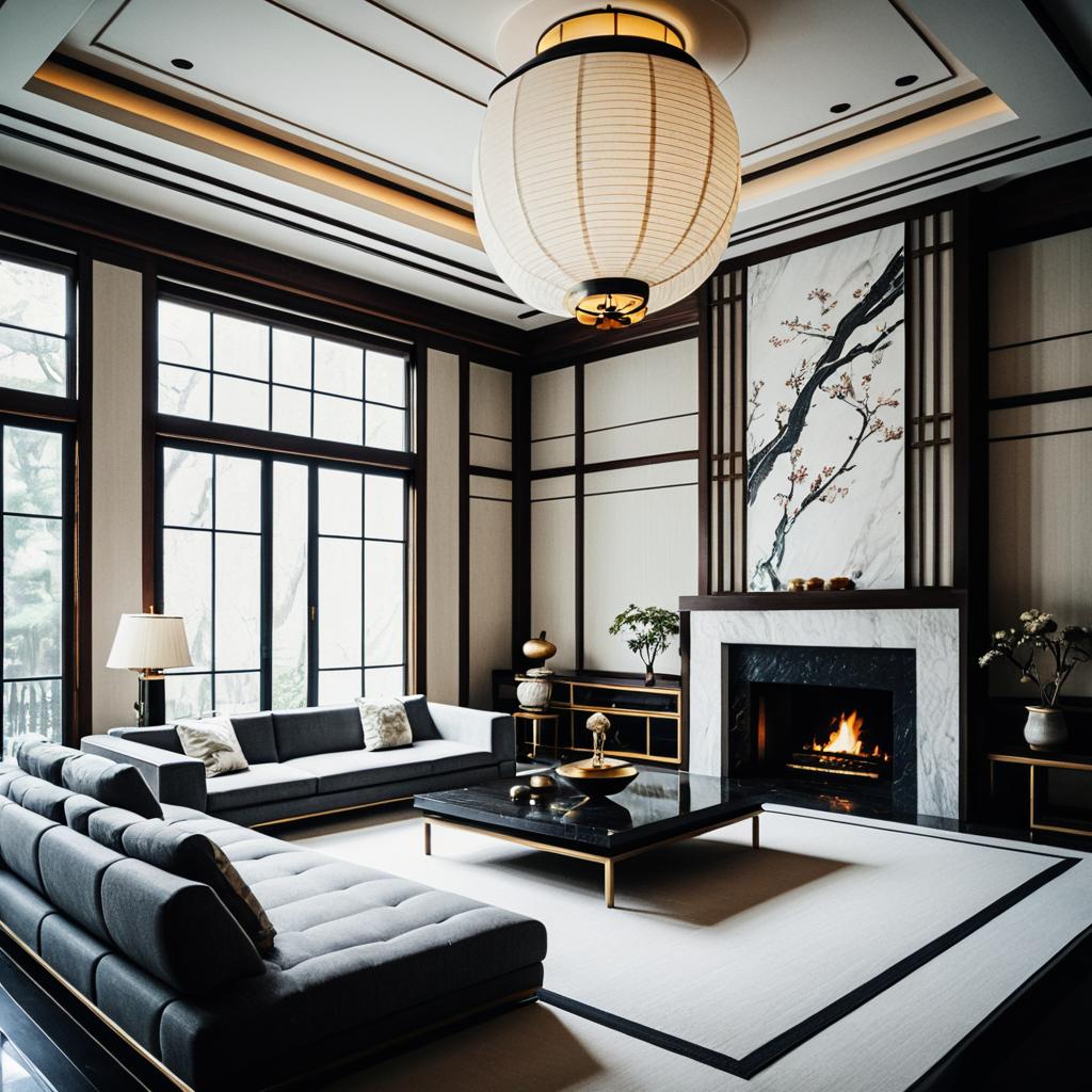 Modern Japanese Living Room with Vinyl Pagoda and Fireplace