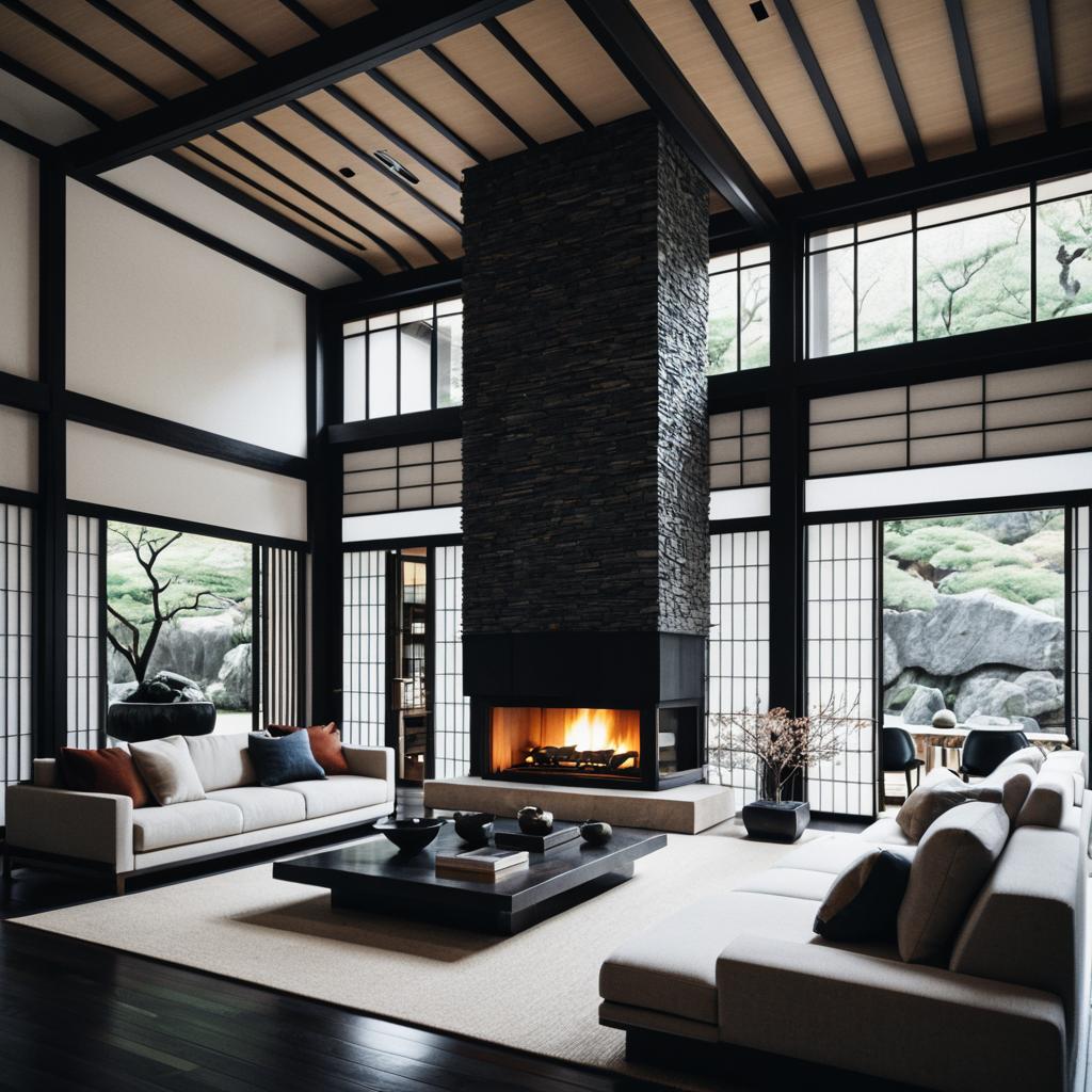 Luxurious vinyl pagoda, modern Japanese living room, zen rock garden decor, high-tech devices, fireplace, coherent composition, architecturally accurate, minimalist photography