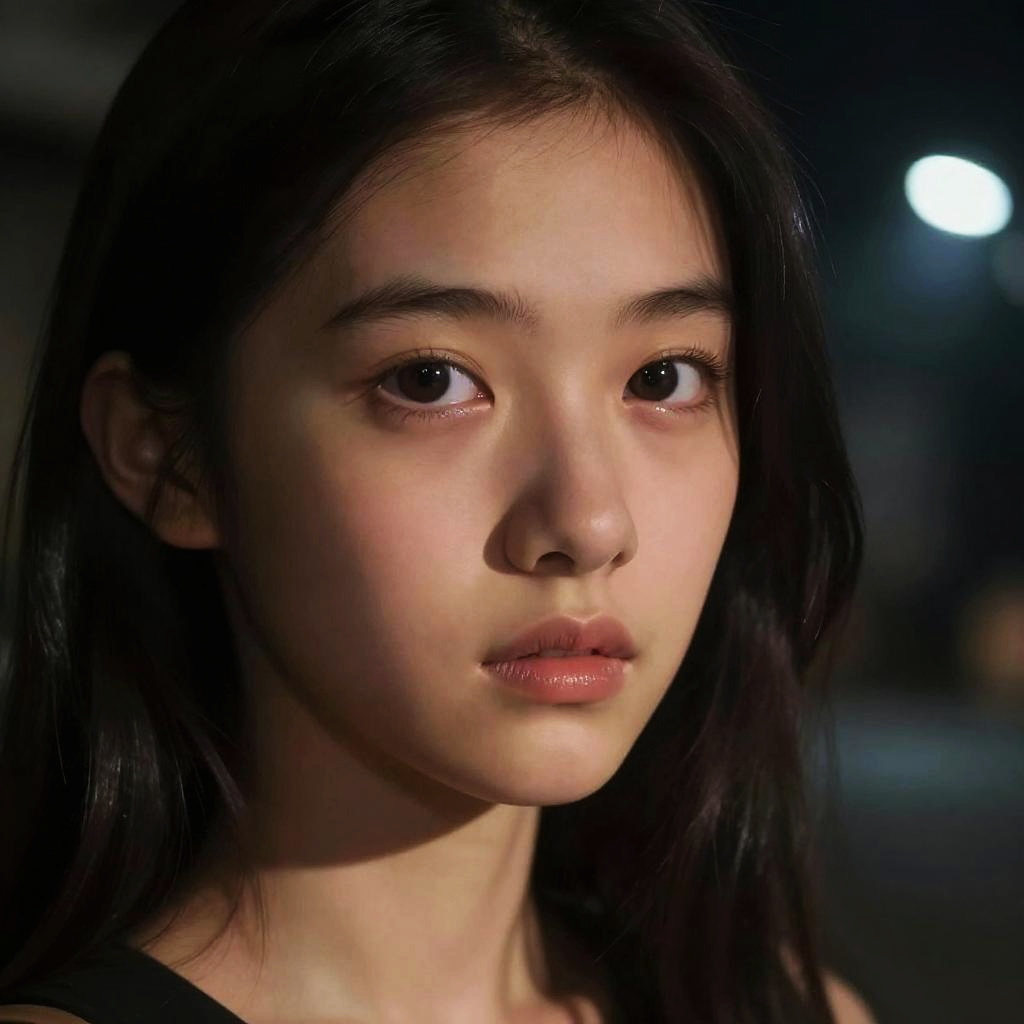 Photograph of a young East Asian woman with fair skin, long black hair, and large, dark brown eyes. She has a slight, neutral expression with pinkish lips. The background is dark and blurry, with a small, bright white light in the top right corner. She wears a black top with subtle white patterns. The lighting is soft, highlighting her face and creating a slight shadow on her left side. The overall mood is introspective and somber.