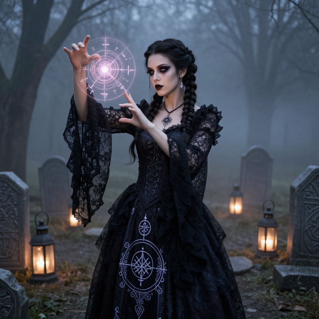 Silver hair goth with pale skin and striking dark makeup, wearing intricate black lace clothing, standing in a misty graveyard at twilight, eerie yet elegant atmosphere, high contrast shadows, detailed textures, moody and mysterious ambiance