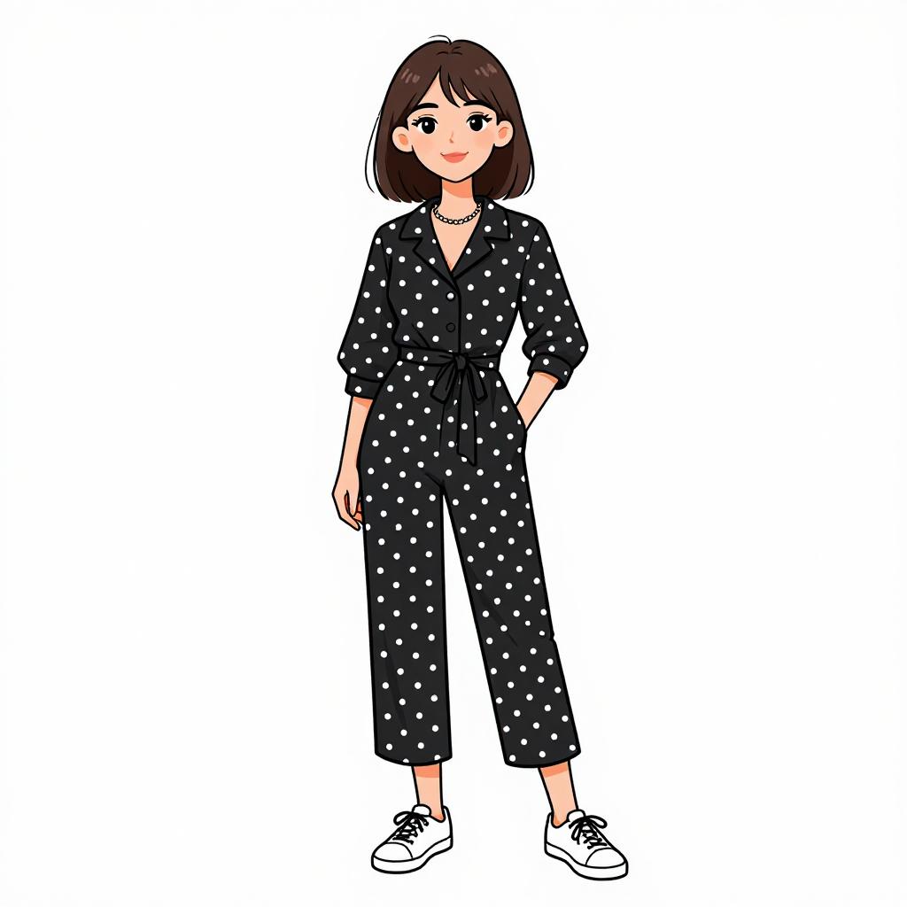 Woman with pretty face and pretty hair. smiling Woman, vintage-inspired, polka dot jumpsuit in black with white dots, v-neckline with collar, three-quarter sleeves, cinched waist with tie belt, cropped straight-leg pants, white casual sneakers, delicate chain necklace, simple makeup, relaxed hairstyle with straight bangs, plain white studio background. --sref 1467