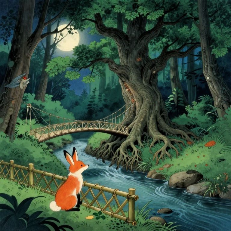 An enchanting digital artwork portrays an idyllic moonlit night in a verdant, mystical forest, blending ukiyo-e woodblock print aesthetics with the dreamlike ambiance of surrealist art. A venerable tree stands prominently at the heart of the scene, its twisted roots extending into a pristine stream flowing beneath a delicate suspension bridge. In the foreground, a gentle woodland creature, a harmonious blend of fox and rabbit traits, watches from behind an intricate bamboo fence. This captivating image encapsulates the serene coexistence of nature and magic, evoking feelings of serenity and intrigue, while emphasizing the ethereal beauty of minute details through a macro perspective that invites viewers to discover the wonders hidden within this whimsical, otherworldly realm.