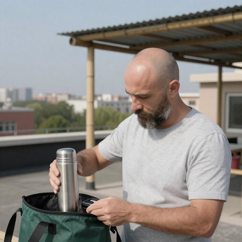 Bald middle-aged man with a beard, wearing a light gray short-sleeve shirt, concentrates while opening a green bag on a rooftop. He holds a stainless steel thermos and a black device. Background includes a cityscape with buildings and greenery. Rooftop structure with bamboo poles and tarp. Daylight, clear sky.