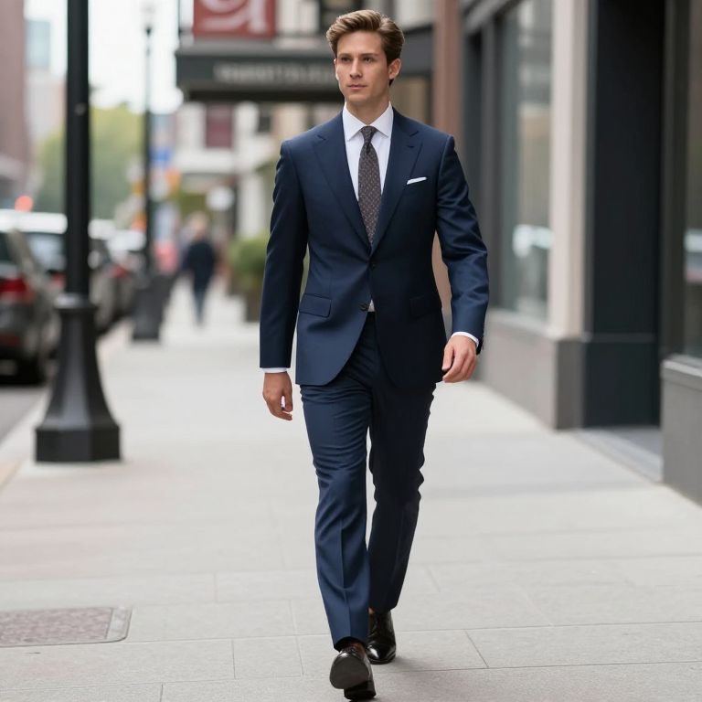 Photograph of a young Caucasian man with short, light brown hair, walking confidently down a city sidewalk. He wears a dark blue, tailored suit with a white dress shirt and a patterned black tie. A white pocket square is neatly tucked into his suit jacket's breast pocket. He has a clean-shaven face, and his expression is focused. The background shows an urban street with blurred buildings, streetlights, and a few pedestrians. The sidewalk is light gray, and the building on the right has large glass windows. The lighting is natural, suggesting daytime.
