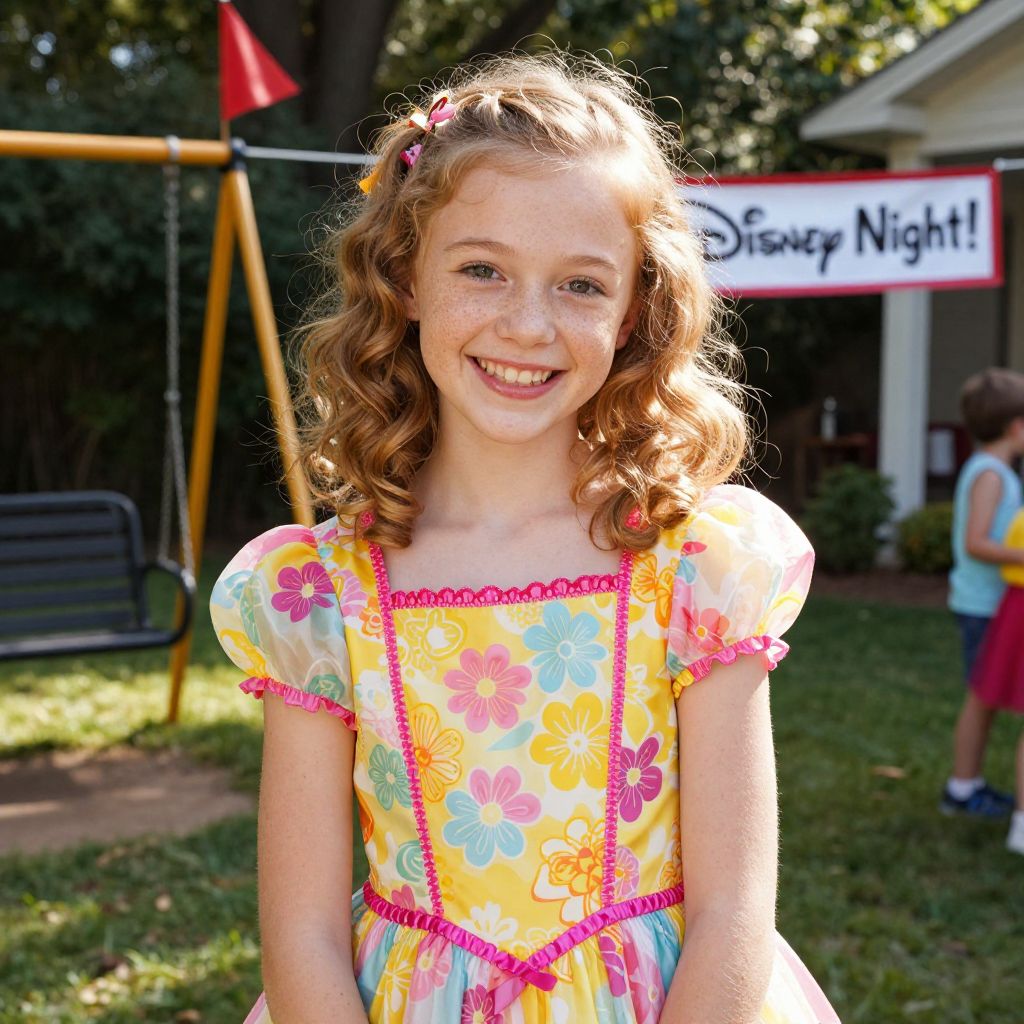 A joyful teenage girl with curly golden hair and freckles across her nose and cheeks, dressed in a cheerful Disney party dress costume with a yellow and pink floral pattern and puffy sleeves, smiling at the camera during a family reunion in a sunny backyard with a swing set, a red flag, and a banner reading 'Disney Night!'
