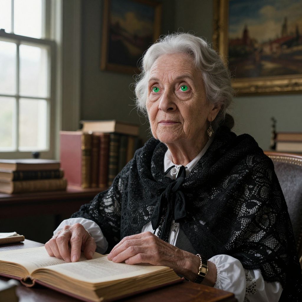 A hyperrealistic portrait showcases an astute elderly Pacific Islander woman with vivid green eyes and silvery-white hair, capturing the essence of 18th-century Dutch painting. Set within her cozy study, amidst aged books and paintings, she bathes in soft light from a large window. Her expression is one of contemplation and satisfaction, gazing off into the distance as if lost in thought. From an intriguing bug's-eye view, the intricate details of her creased hands on an old journal and the delicate lace of her black shawl take center stage, creating an emotional gradient that embodies a lifetime of wisdom, experiences, and quiet introspection.