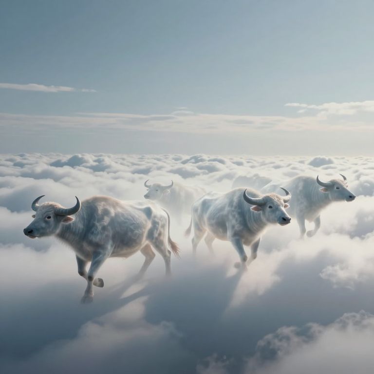 A surreal procession of ethereal buffalo traverses the heavens, their translucent forms casting shadows of memory and dreams upon the clouds, while the air hums with the echoes of laughter and forgotten melodies, evoking a poignant blend of freedom and nostalgia.