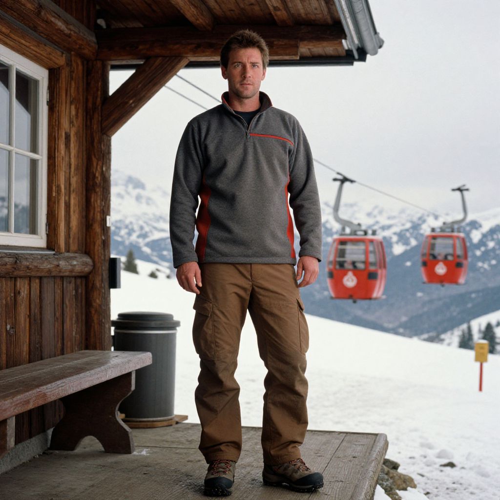 Photograph of a Caucasian man standing on a wooden porch of a rustic ski lodge. He has short brown hair, a medium build, and is wearing a gray and red zip-up fleece jacket with brown cargo pants and black boots. The wooden porch has a bench to the left and a barrel in the background. In the snowy, mountainous background, three red ski gondolas are visible. The sky is overcast, and the snow-covered landscape suggests a winter setting. The man's expression is neutral, and he stands confidently with his hands by his sides.