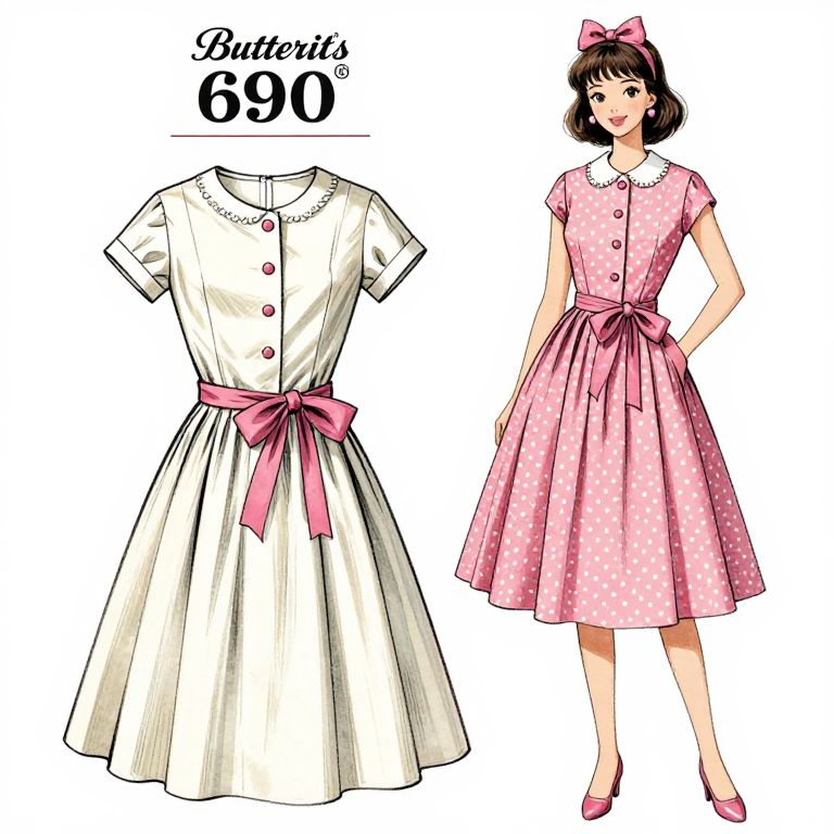 Digital illustration of a 1950s-style dress: white with pink bow and buttons, and pink polka dot version, worn by a woman with