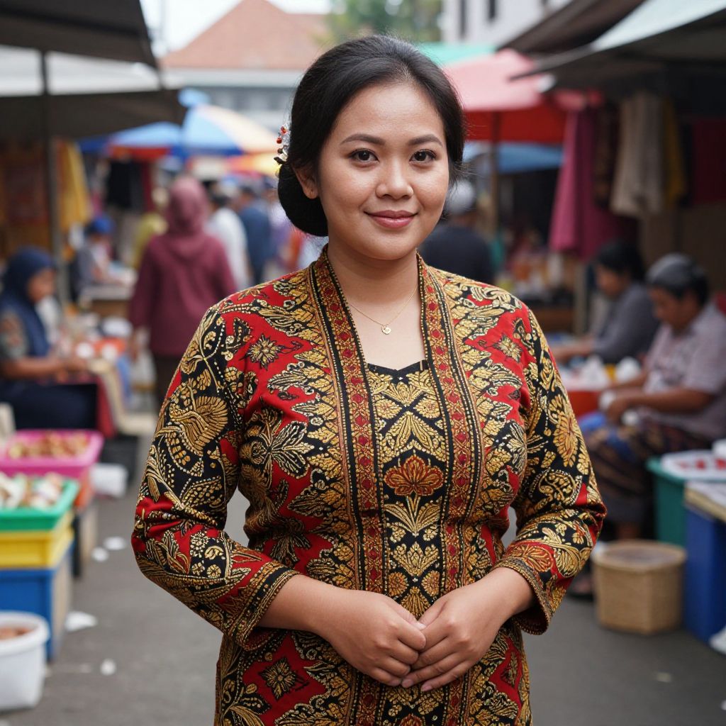 A high-detail photograph of a woman in a stunning Indonesian batik costume, dressed in richly patterned fabric art featuring red, black, and gold motifs, standing in a bustling market in Yogyakarta, with colorful stalls and traditional vendors in the distance, her face showing subtle smiles and cultural pride.. The woman has big tits and cute face