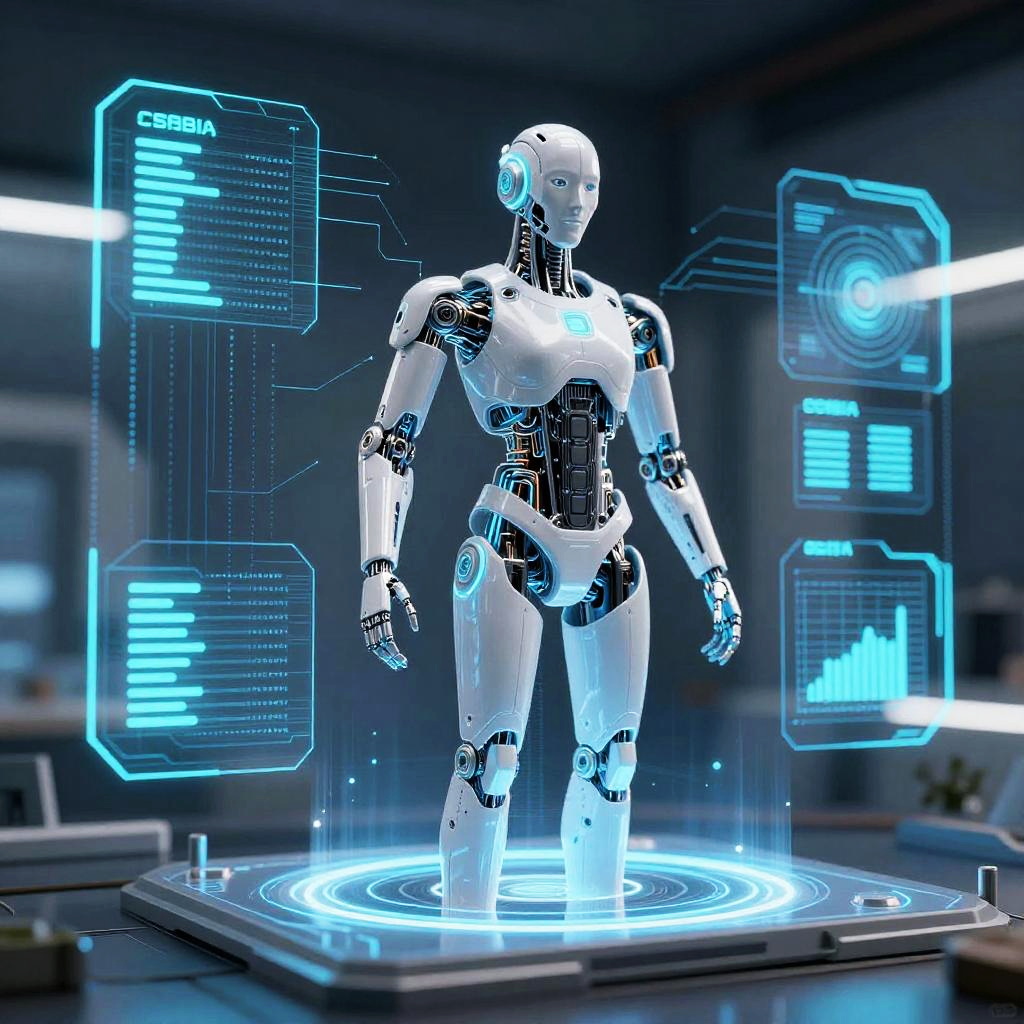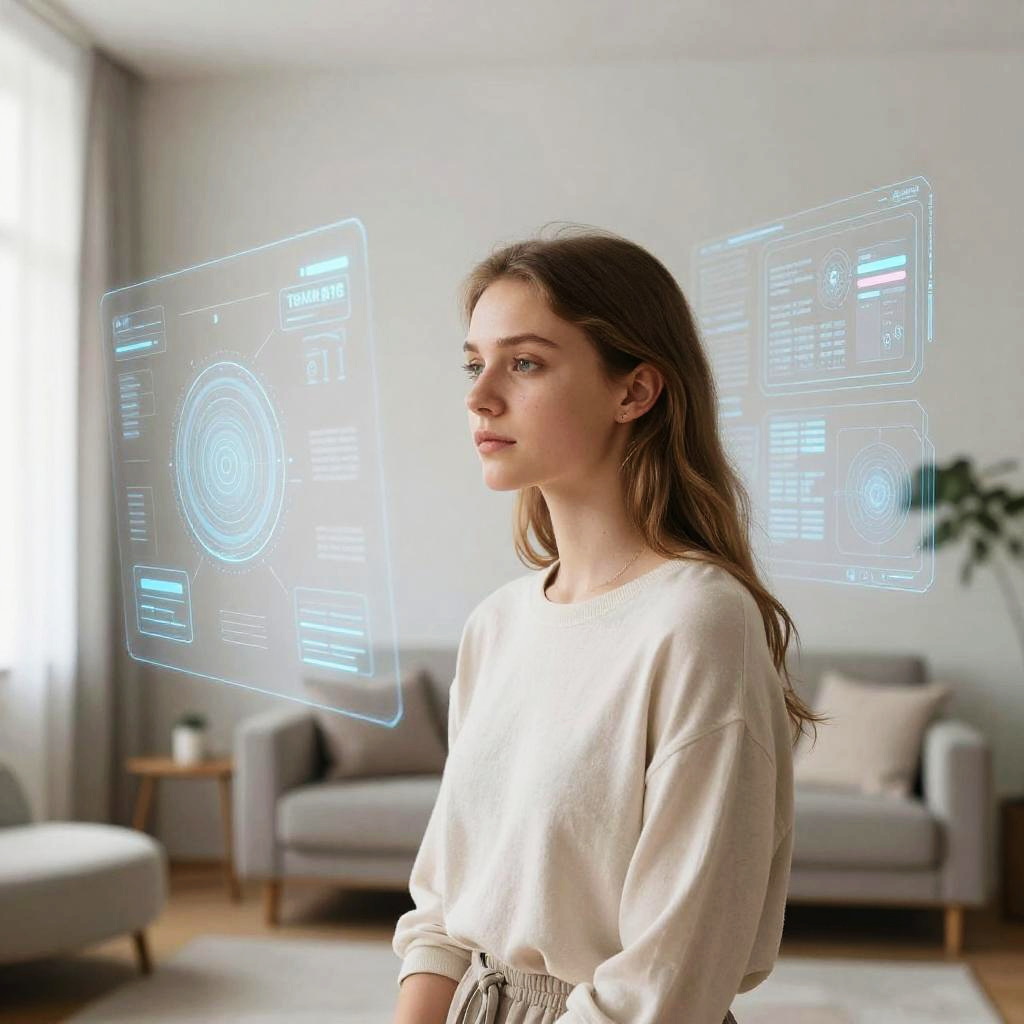 AI Swedish girl in a minimalist Scandinavian room, surrounded by holographic interfaces and advanced technology, soft natural lighting highlighting her serene expression, modern sci-fi theme