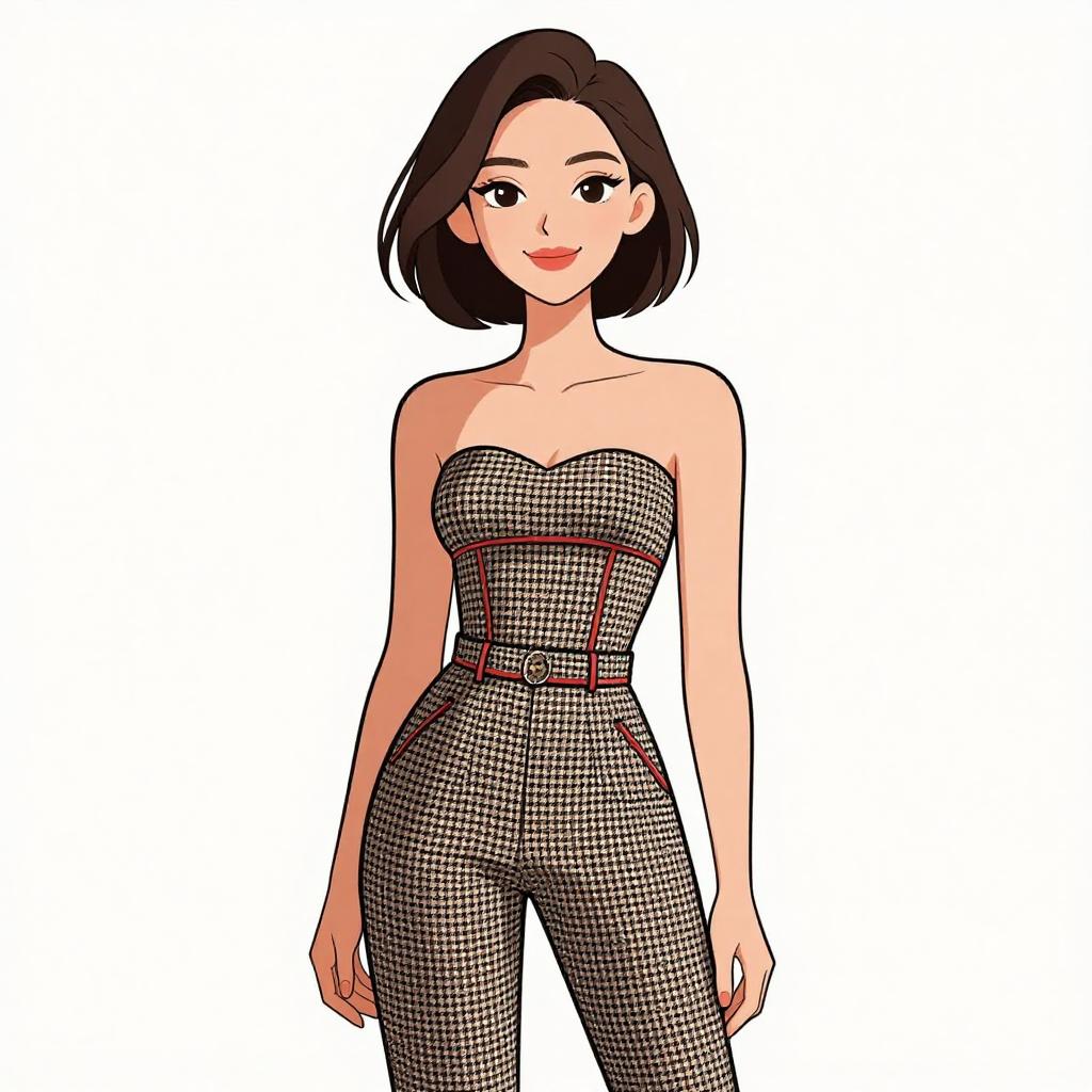 Digital illustration of a smiling woman with short black hair, wearing a strapless, black-and-white checkered jumpsuit, standing against a plain white background