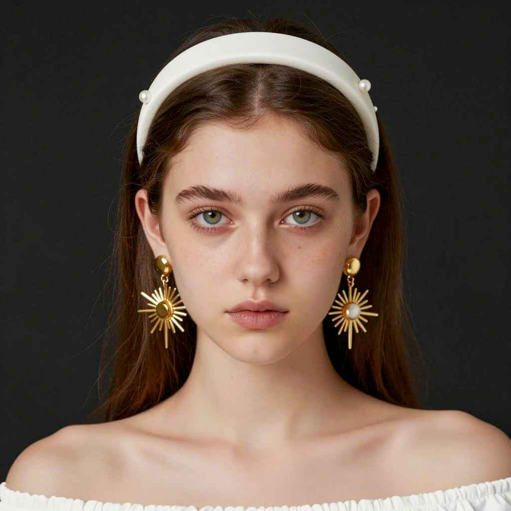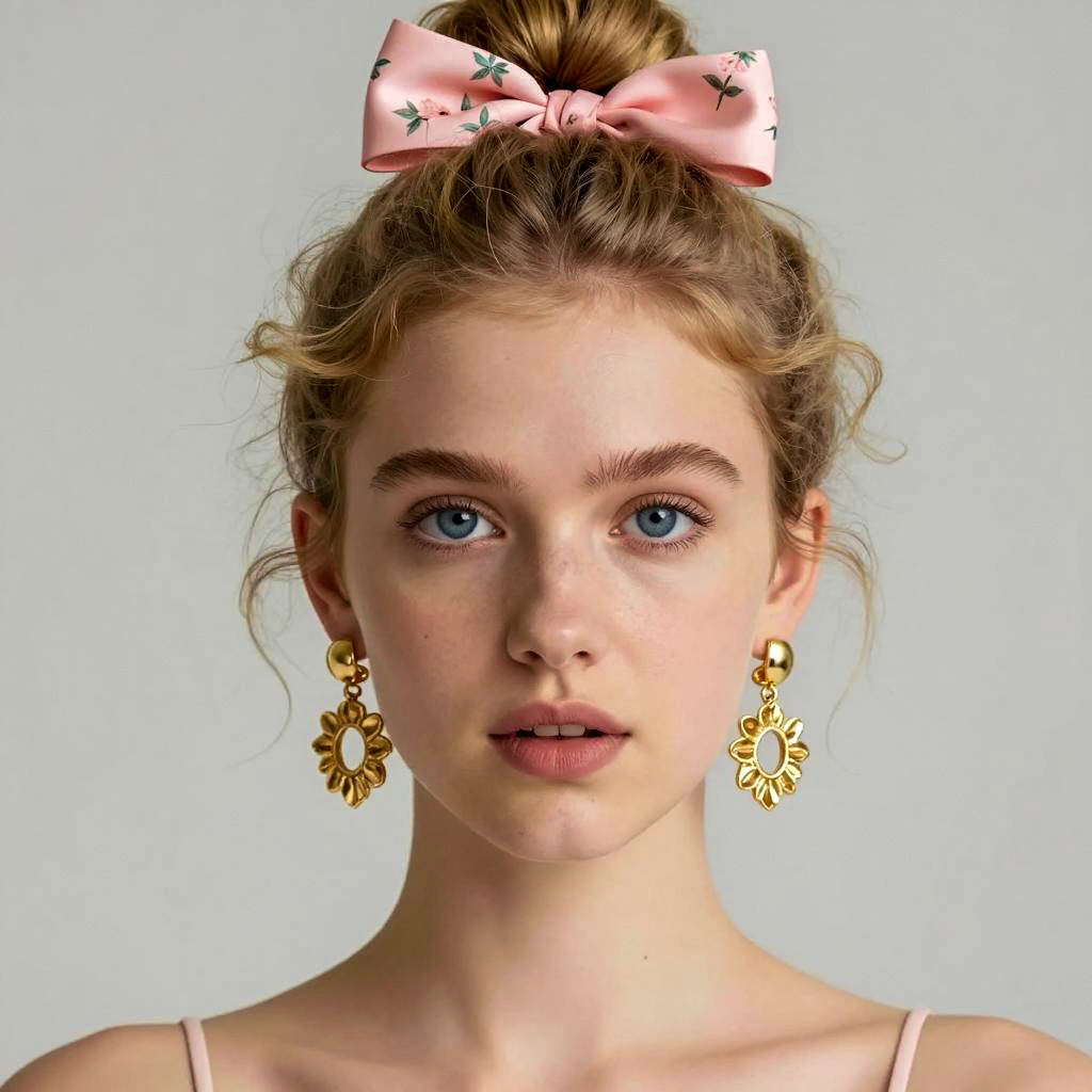 Photograph of a young woman with fair skin and dark brown hair. She has large, colorful floral headpiece with pink and yellow flowers. She wears pink, intricate earrings and a brightly colored, patterned dress with pink, red, and blue stripes. Background is a vibrant, colorful floral pattern. Her facial expression is neutral, with red lipstick.