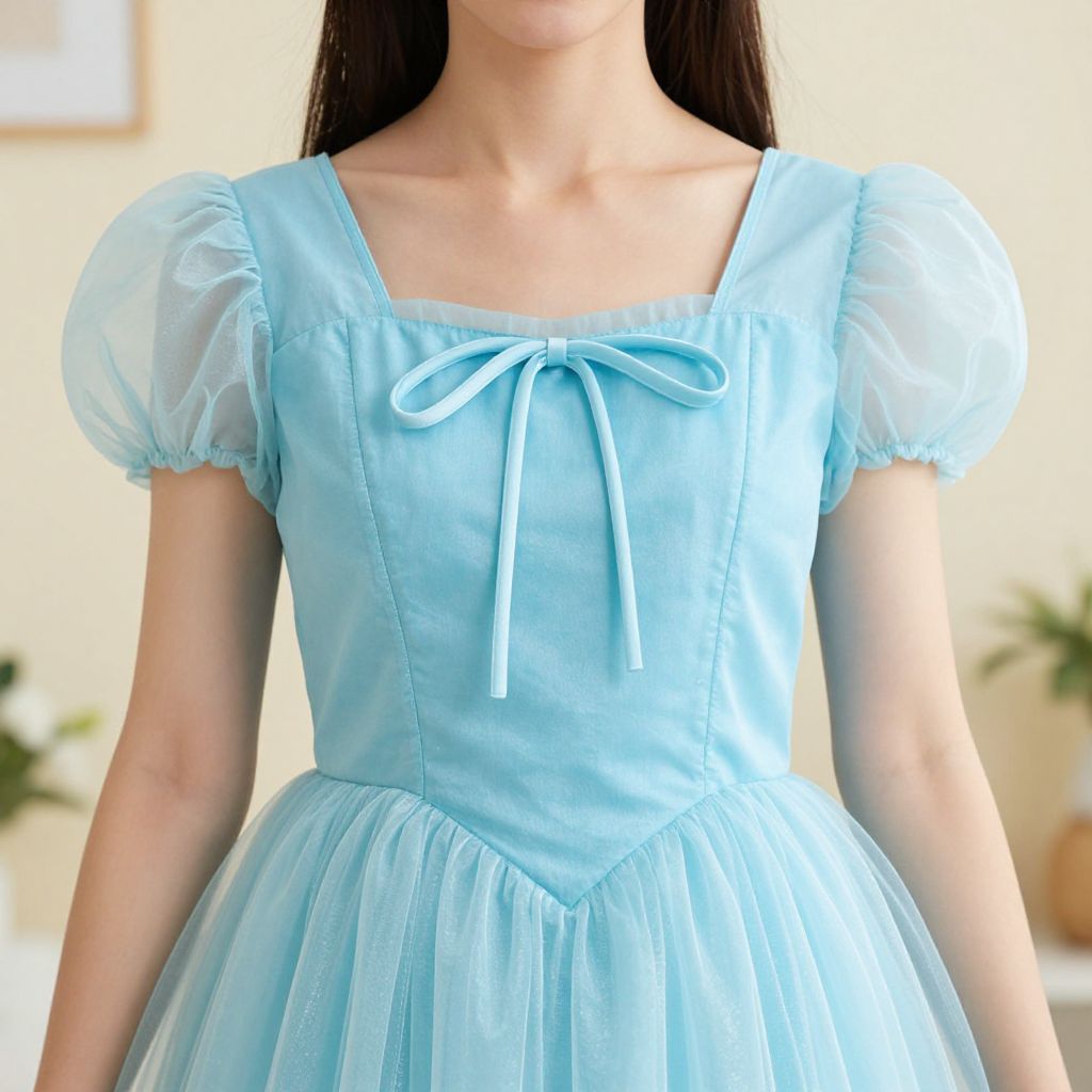 Photograph of a young woman with long, straight dark hair, wearing a light blue, short-sleeved, square-neck dress with puffed, sheer sleeves and a white ribbon bow at the center of the chest. The dress has a fitted bodice and a flared, tulle skirt. Her fair skin contrasts with the soft, pastel color of the dress. The background is blurred with light green and beige tones, suggesting an indoor setting with plants and soft lighting. The focus is on the dress and her upper body, with her face not visible.