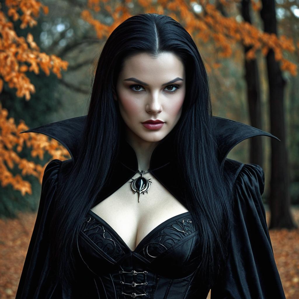 Portrait of a young woman wearing a black velvet cloak with silver embroidery and a hood, styled in a witch outfit. She has dark hair with a side part, dressed in a corset top, black leather pants, and black ankle boots with pointed toes and buckles. The setting is a moody, dreamlike forest path with fallen leaves and bare trees, creating a mysterious atmosphere.
