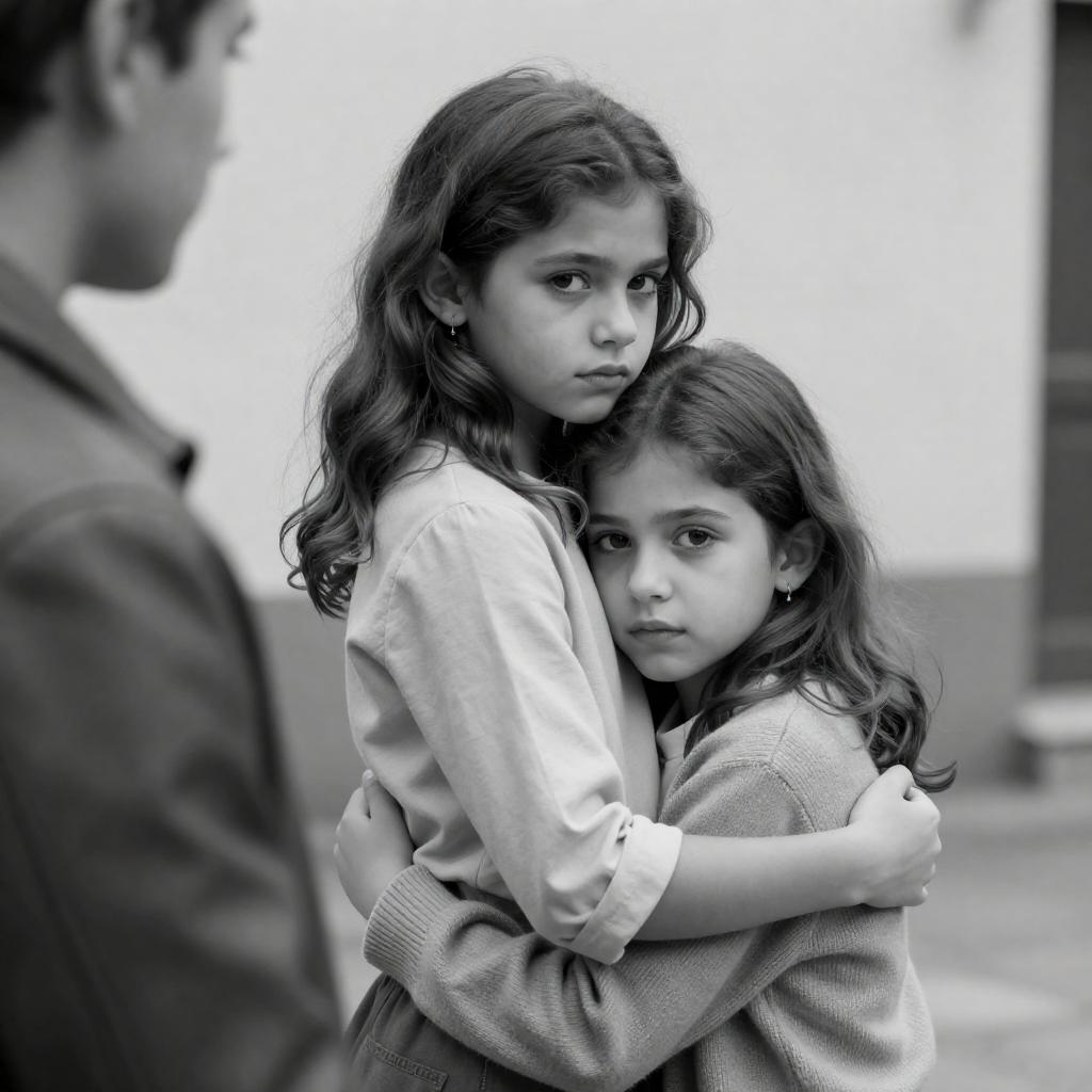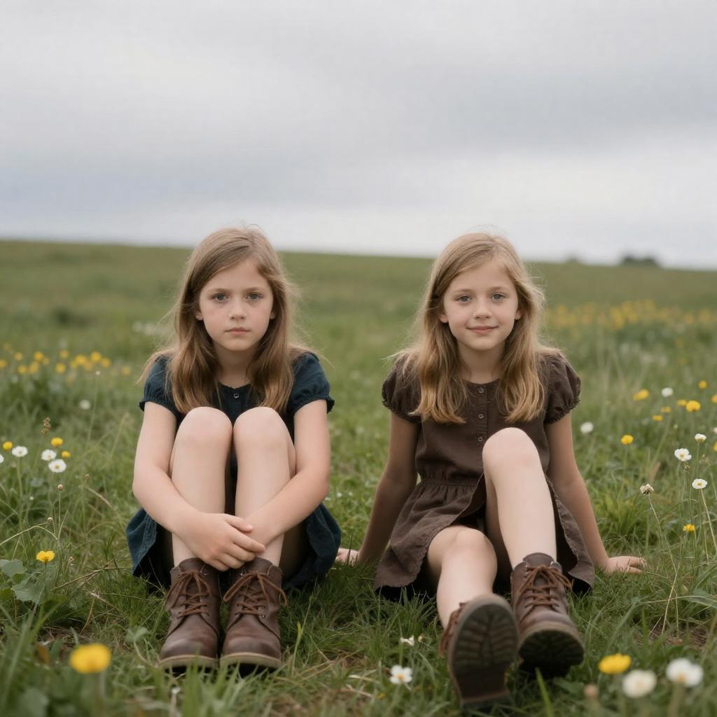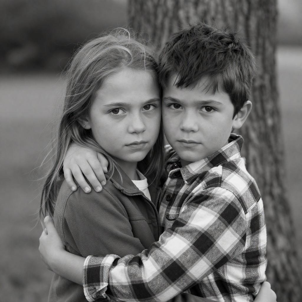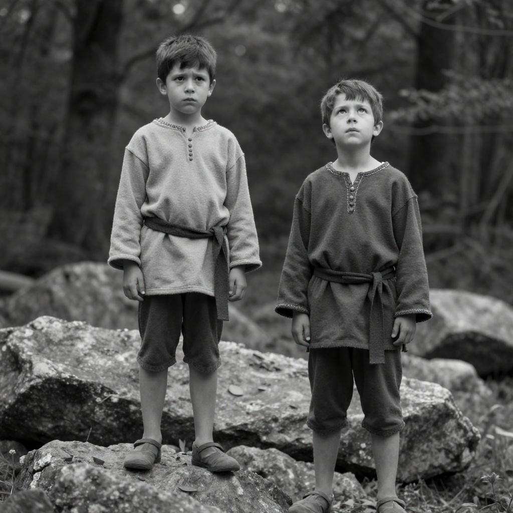 Sepia photograph of two children standing in front of a stone wall. Girl on left in light dress and boots, holding a small object. Boy on right in dark jacket, shorts, and shoes, holding a toy gun. Elderly woman sitting in background. Both children have serious expressions.