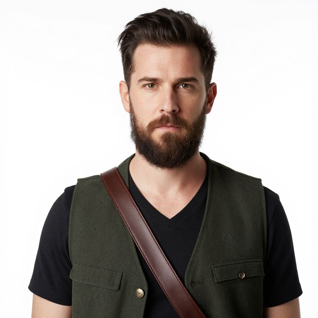 A photo of a bearded man with short, dark hair, and fair skin, standing against a white background. He's wearing a dark green, sleeveless vest over a black shirt, with a brown leather strap crossing his chest. He has a serious expression and is looking straight at the camera. The lighting is bright and even.