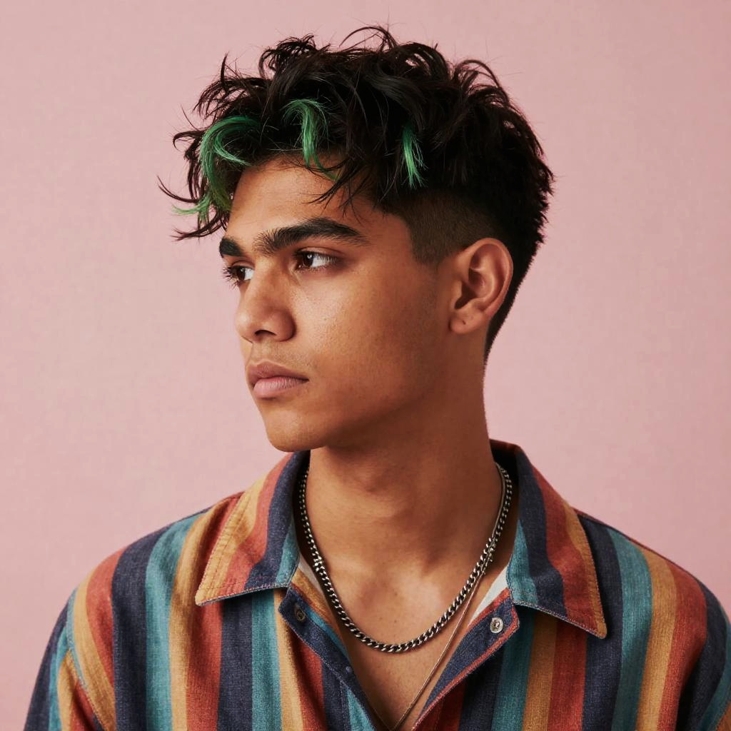 Photograph of a young man with a medium skin tone and dark, messy hair featuring green highlights on the left side. His hair is styled with a undercut on the right. He's wearing a multicolored striped shirt with layered necklaces. The background is a textured, warm pink. He's looking to the left with a serious expression.