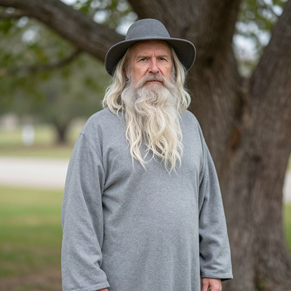 Photograph of an elderly white man with a long, white beard, wearing a gray hat and loose gray shirt, standing in front of a large tree