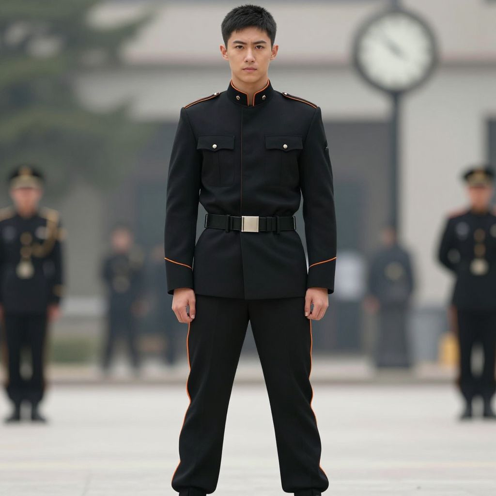 Photograph of a young Asian male soldier standing in a formal military setting. He has short, black hair and a serious expression. He wears a black military uniform with red trim on the sleeves and trousers, and a silver belt buckle. The background is slightly blurred, featuring other soldiers in similar uniforms and a large, circular clock. The ground is white, and the setting appears to be outdoors with some greenery visible. The soldier's uniform is neatly pressed, and he stands with a straight posture, emphasizing discipline. The overall color palette is dominated by black and white.