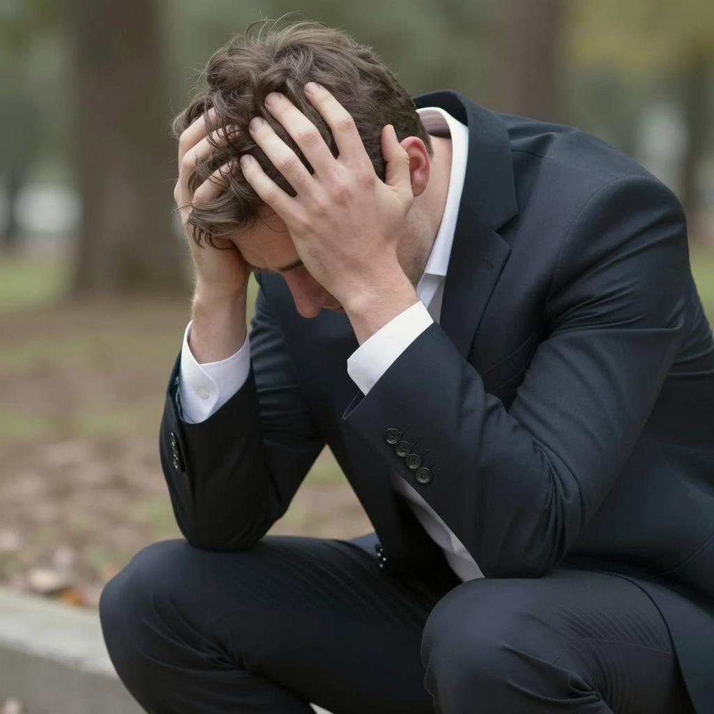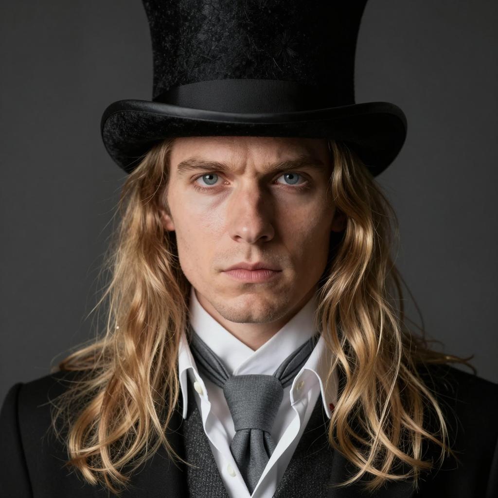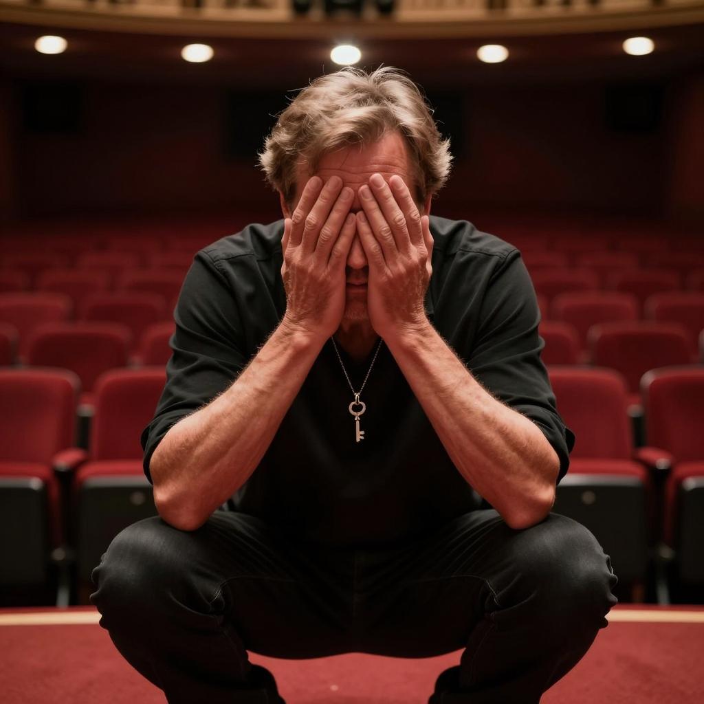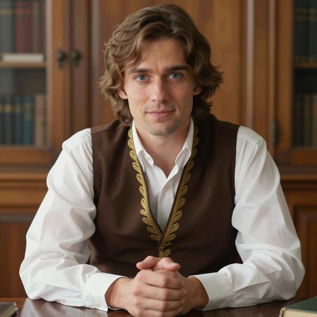 Man with long brown hair, wearing black coat and pants, leans forward, head resting on wooden grand piano. Dark wood-paneled room with ornate details. Sunlight casts shadows on patterned carpet. Piano has curved legs and dark trim. Background includes a large, ured vase and wooden door.
