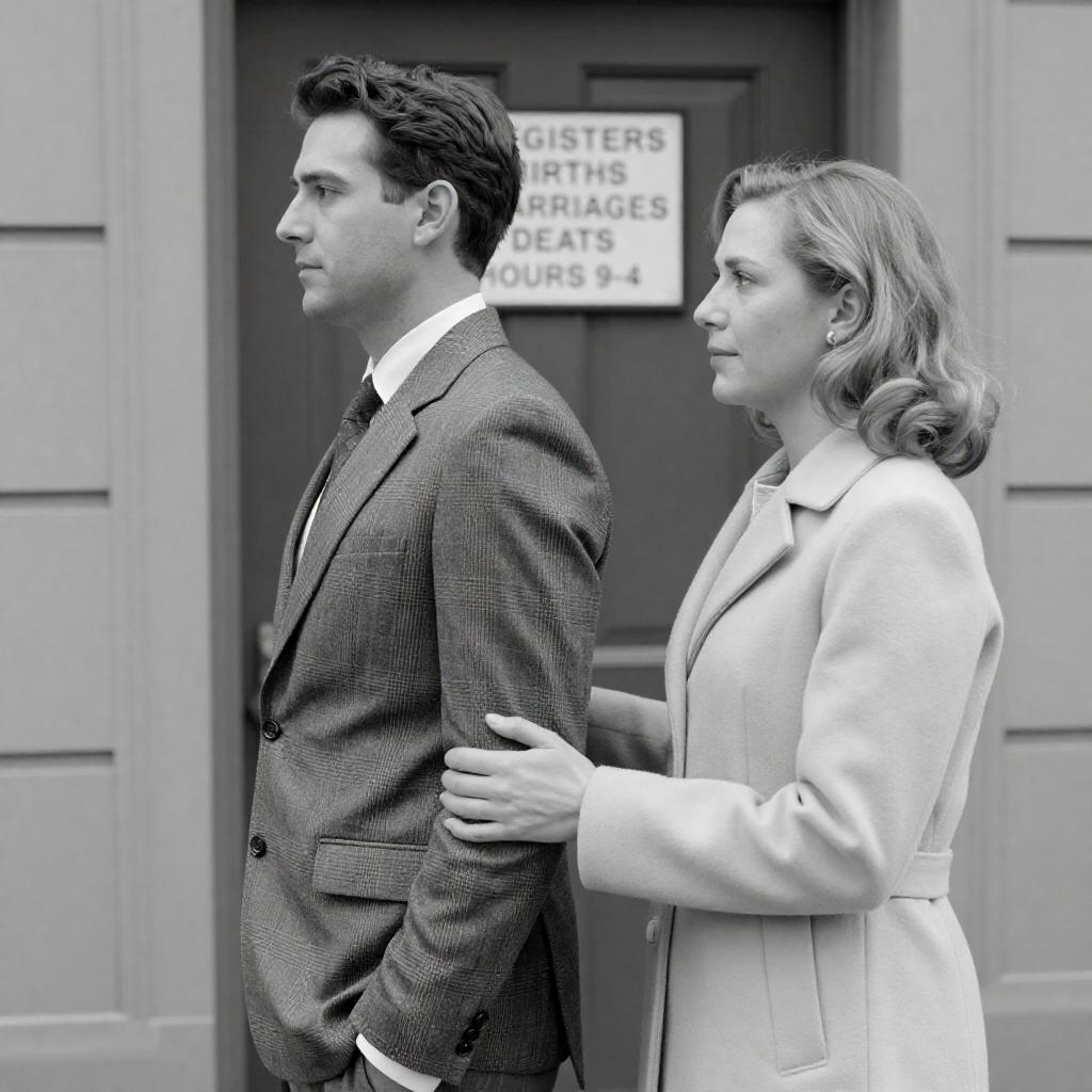 Black and white photograph of a man and woman standing side by side in front of a registry office door. The man wears a plaid suit and tie, with dark hair styled neatly, shown in profile facing left. The woman, with light wavy hair, wears a light-colored coat and gazes right while gently holding the man's arm. The background features a sign indicating registry services for births, marriages, and deaths with office hours.