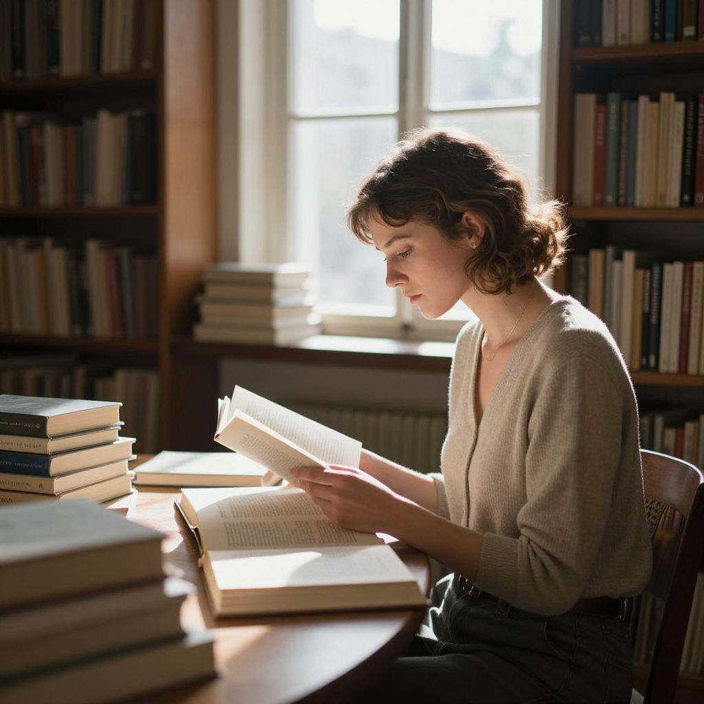 Woman engrossed in reading, illuminated by soft sunlight streaming through a library window, surrounded by shelves brimming with books and a table stacked with open volumes.