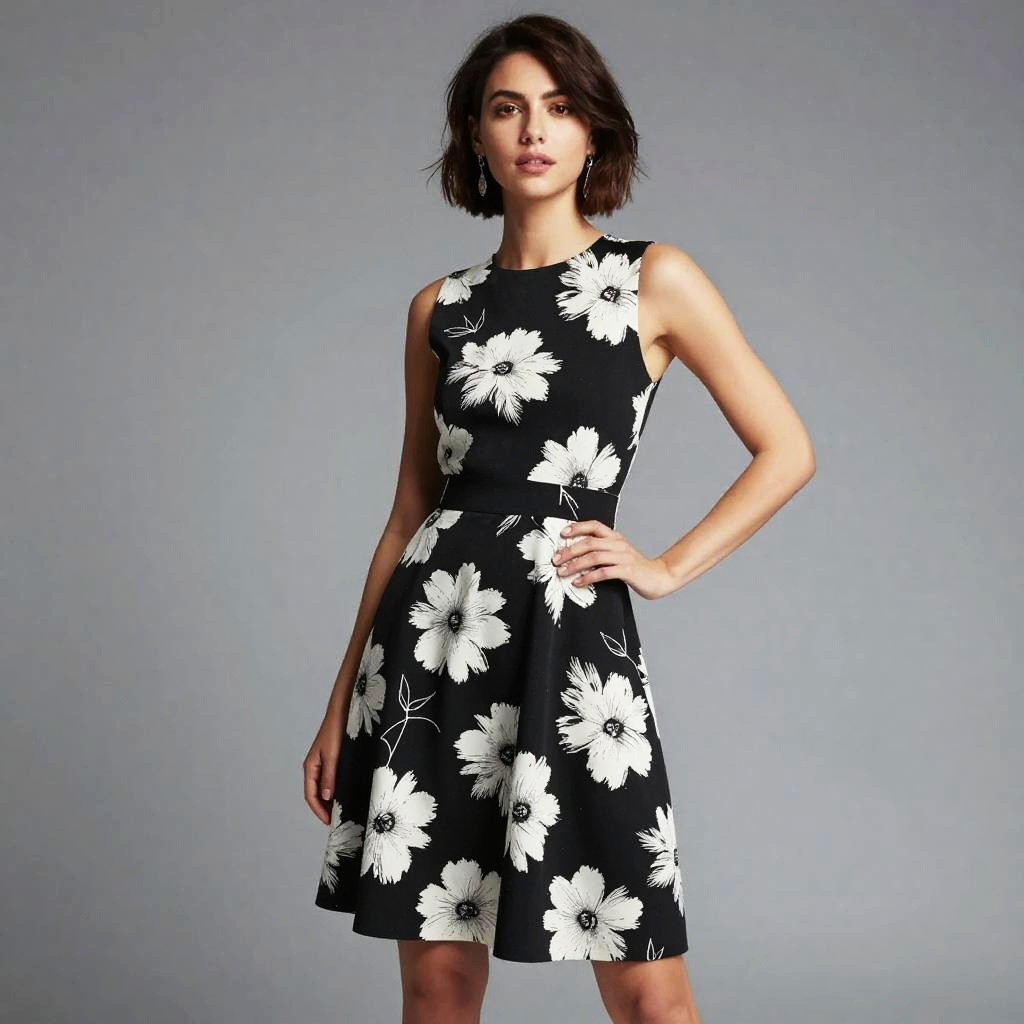 Photograph of a confident woman with short, dark brown hair and fair skin standing against a solid gray background. She's wearing a sleeveless, black dress with a white floral pattern, featuring large, bold flowers. The dress has a fitted bodice and a flared skirt. She's accessorized with dangling earrings and has a hand on her hip, exuding a stylish, modern vibe.