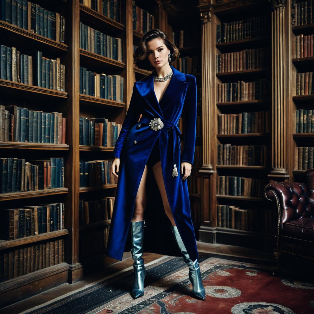 Woman in Versace hi heels boots, color photo by Paolo Roversi, wearing indigo velvet wrap coat with silver brooch, in antique library with towering bookshelves, high-fashion editorial, cinematic lighting, full-body shot, elegant pose, sharp focus, rich textures, glossy magazine aesthetic.
