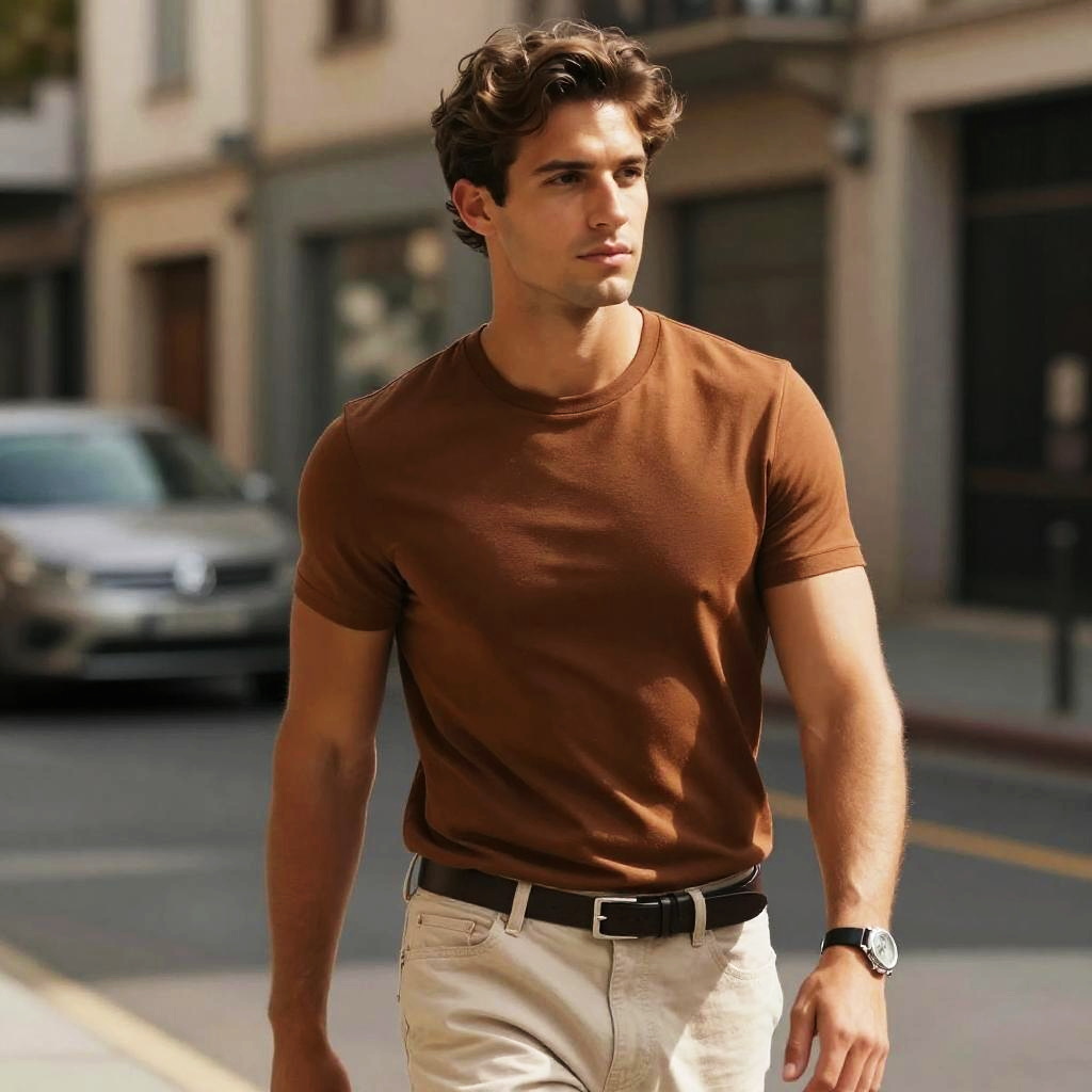 Elegant man with carmel skintone wearing modern casual clothes, urban street setting, warm sunlight highlighting smooth skin texture, vibrant colors, cinematic style