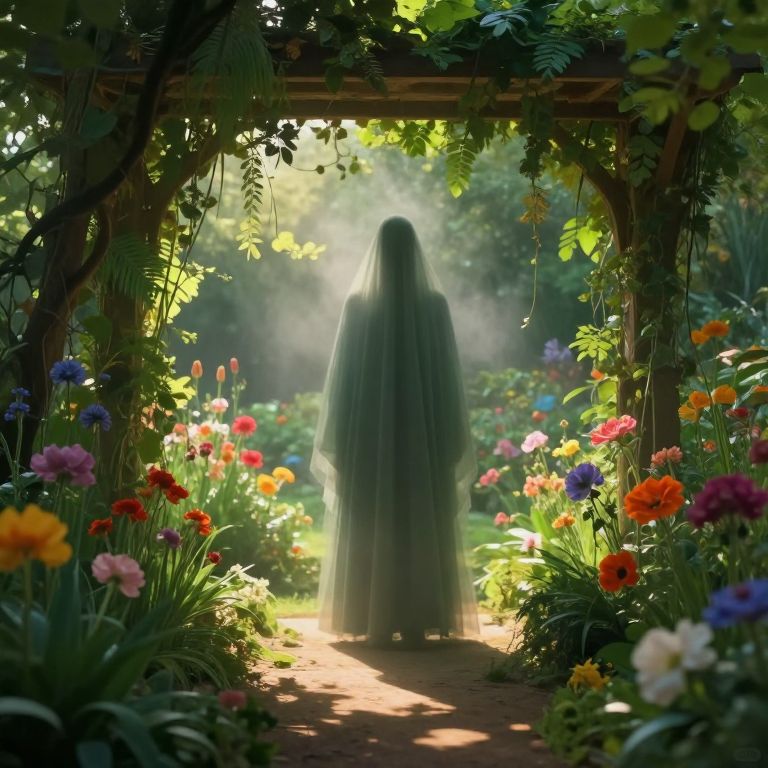 Imagine an enigmatic digital artwork reminiscent of Magritte's iconic imagery, featuring a captivating garden teeming with vivid blooms and verdant foliage, as seen from beneath a table. A cloaked figure draped in ethereal mist obscures the central vista, revealing only faint silhouettes of its form, tantalizingly out of reach yet inviting further exploration. The interplay of dappled sunlight filtering through the lush vegetation infuses warmth and depth into this surreal scene, captivating the viewer's imagination while evoking a sense of mystery and wonder in an 8k resolution masterpiece.