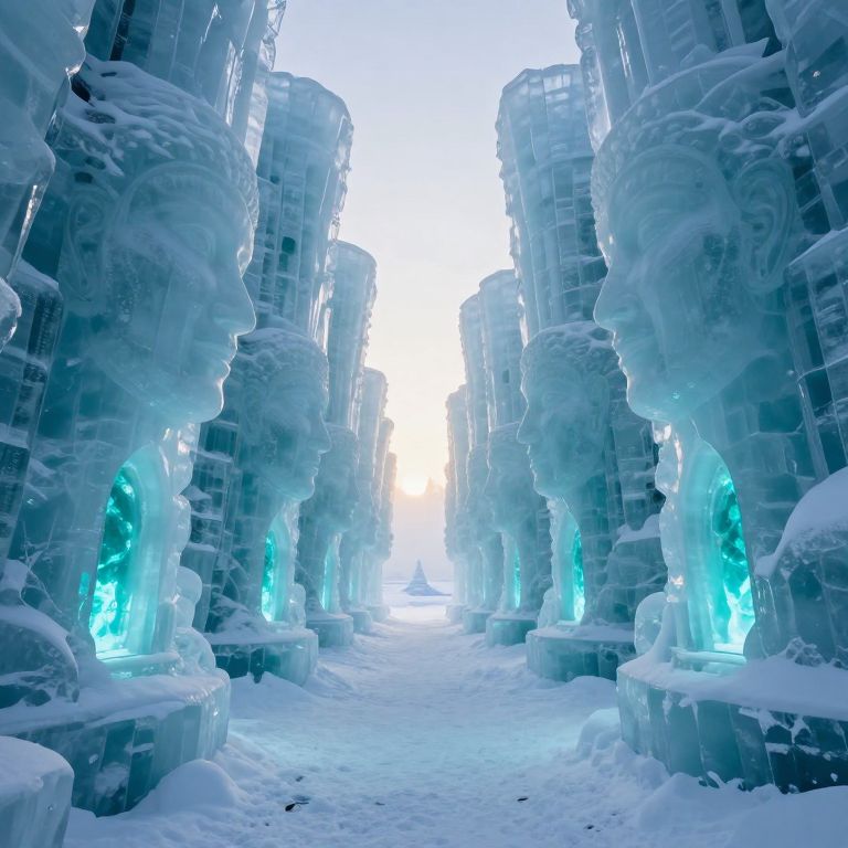 A mesmerizing corridor of ice towers, carved with ethereal faces and glowing teal portals, stretches infinitely toward a radiant horizon, defying gravity and reality in its surreal, otherworldly grandeur.