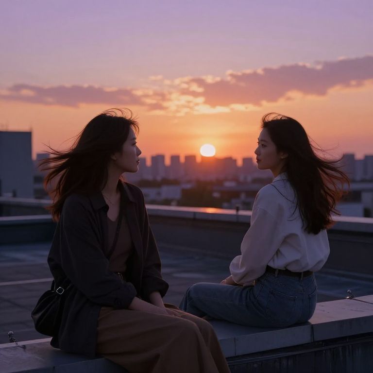 Photograph of two Asian women with long, flowing hair sitting on a rooftop at sunset. Both wear casual, loose-fitting clothing; the woman on the left in a dark brown blouse and brown skirt, the woman on the right in a white blouse and blue jeans. They face each other, smiling, with the orange and purple sunset in the background, casting a warm glow over the city skyline. Their hair is gently blowing in the breeze. The rooftop has a simple, industrial look with visible edges and a metal railing. The sky is vibrant with scattered clouds.