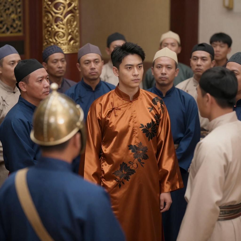 Photograph of a crowded indoor scene. Central male figure in orange satin robe with black floral designs, standing confidently. Crowd of men in traditional blue and beige robes, some with hats, surrounding him. One man with golden helmet in foreground, back to camera. Intense expressions on faces. Ornate wooden pillars and decorative wall in background.