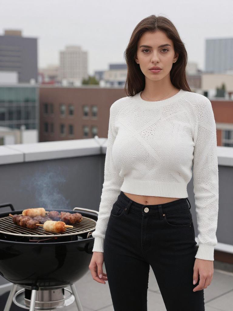 Photograph of a young woman standing on a rooftop with an urban cityscape in the background. She has long, straight brown hair and a fair complexion. She wears a white, long-sleeve, knit crop top that reveals her midriff and high-waisted black jeans. Her expression is neutral. To her left, there's a black charcoal grill with smoke rising, featuring several pieces of grilled meat, including sausages and small skewers. The rooftop has a gray concrete surface, and the cityscape includes blurred buildings and a cloudy sky. The overall style is casual and modern.