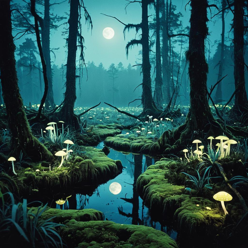 A mystical swamp landscape featuring glowing bioluminescent fungi and dense moss under soft moonlight. The scene includes tall dark trees with hanging moss, a reflective stream, and a misty blue atmosphere, creating a sense of magic and enchantment.