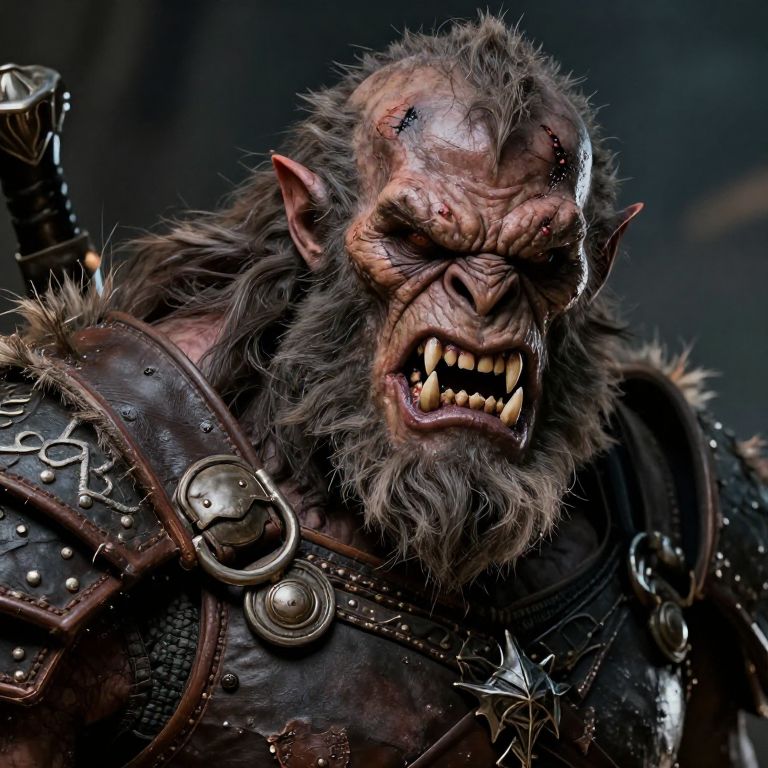 Photorealistic CGI of a fierce, muscular orc with dark fur, sharp teeth, and pointed ears, wearing detailed, spiked leather armor.