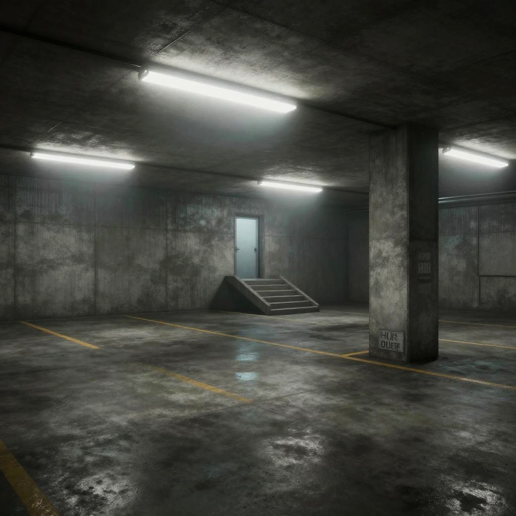 Backroom, liminal space, uploaded artstation, Level-1, Habitable Zone, inside, parking area, car parking, pillar, large space, dark, fluorescent light, concrete wall, concrete floor, , stairs, door, fog, (photorealistic), [sharp focus], (HDR), (8k), (gigapixel), (masterpiece)