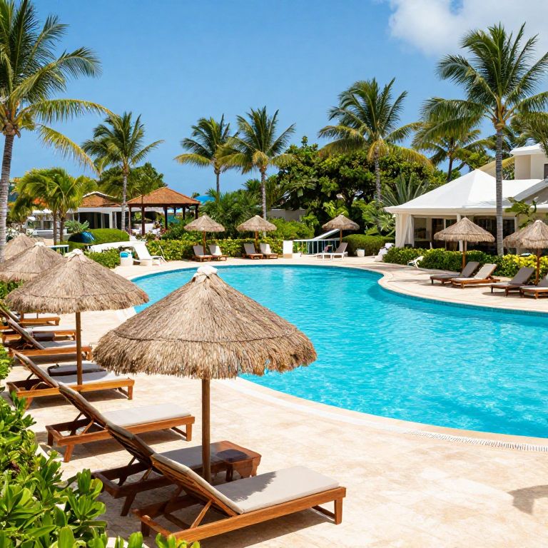 Lush tropical landscaping surrounds a vibrant turquoise pool complex at Hotel Be Live Collection Punta Cana, featuring multiple lounging areas with neatly arranged wooden sunbeds and straw umbrellas, complemented by palm trees and greenery, all under a clear blue sky.