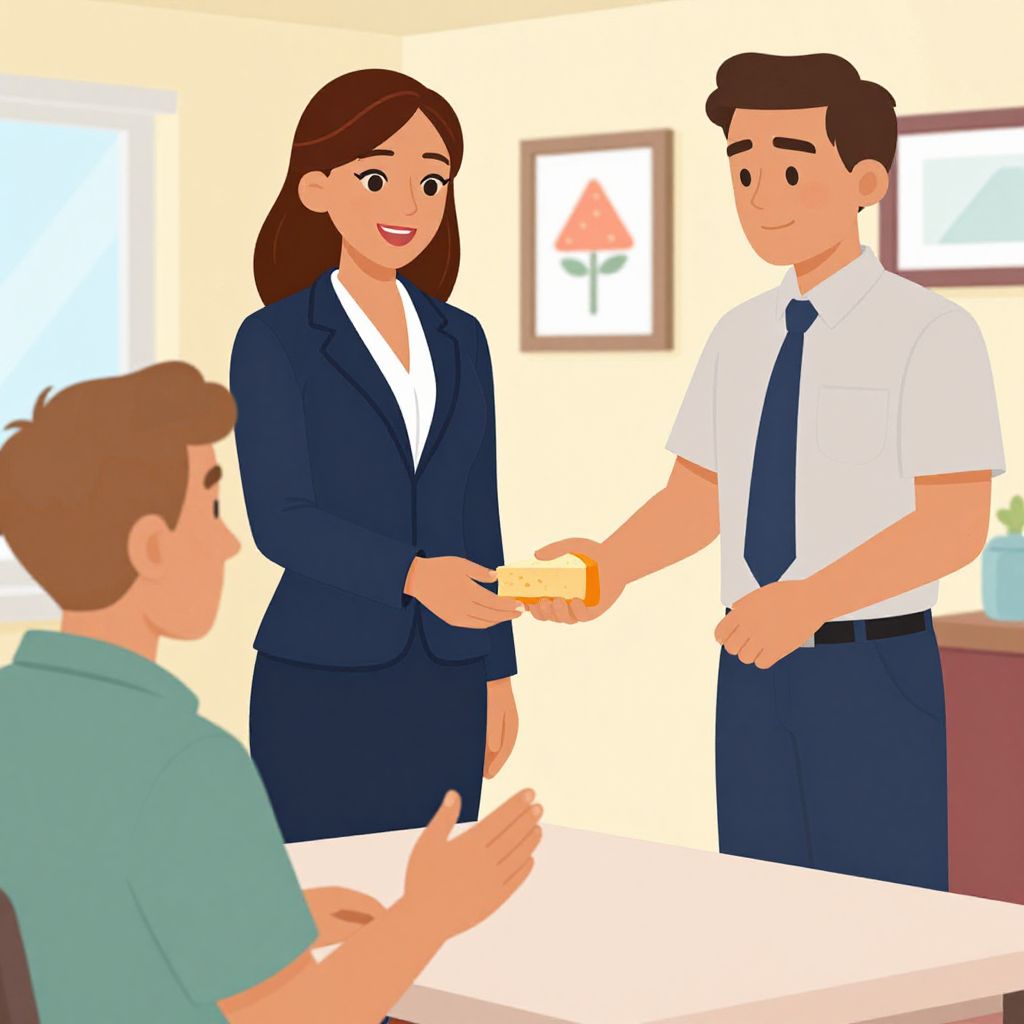 Video Recording cartoon of a man making a transaction with an air hostess by paying with a stick of goat cheese,